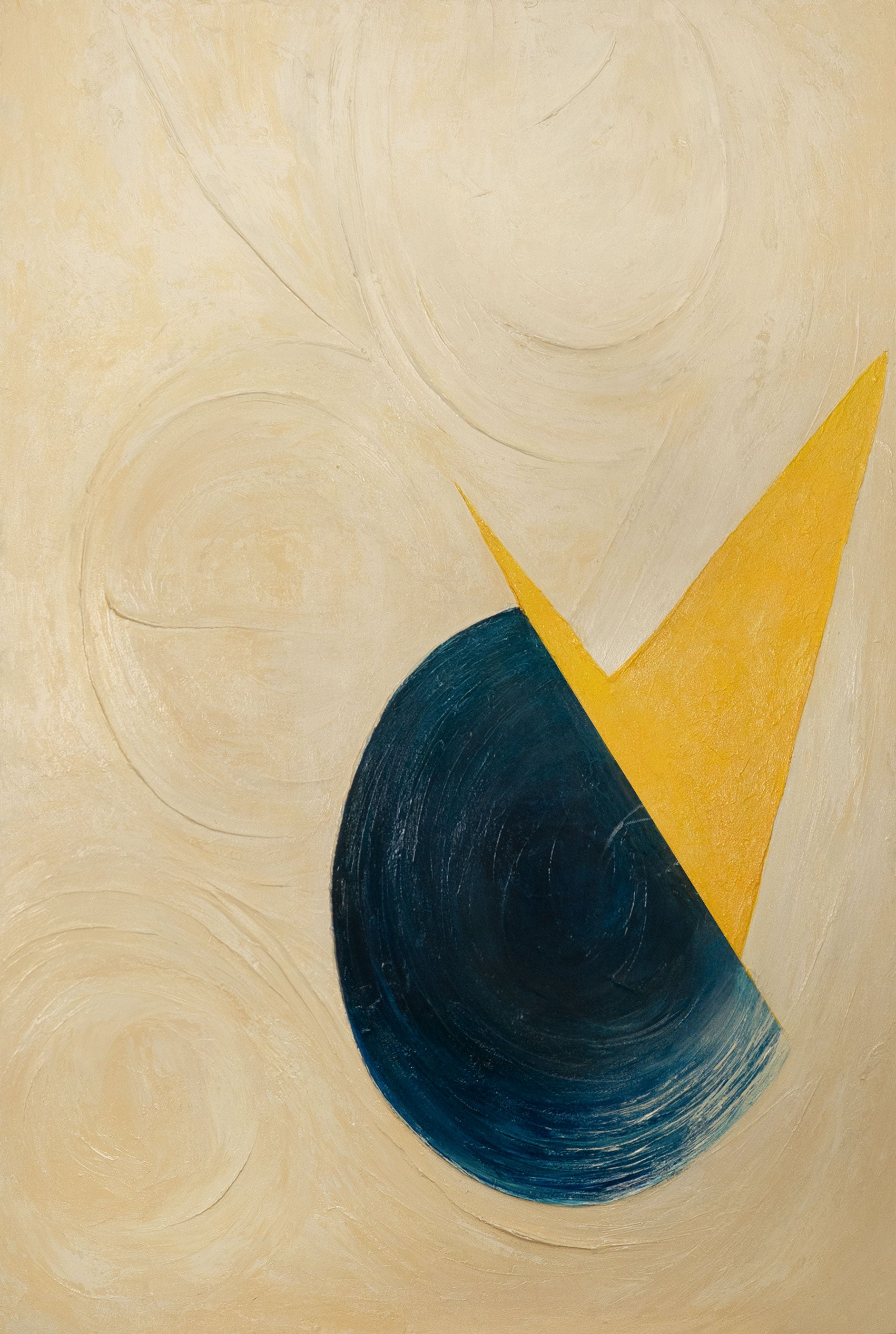 "Cut through the Horizon" is an exciting, hand-painted acrylic painting that captivates with clear geometric shapes and powerful colors. The composition of a deep blue circle and a striking yellow triangle creates dynamism and symbolizes the interplay of balance and contrast.