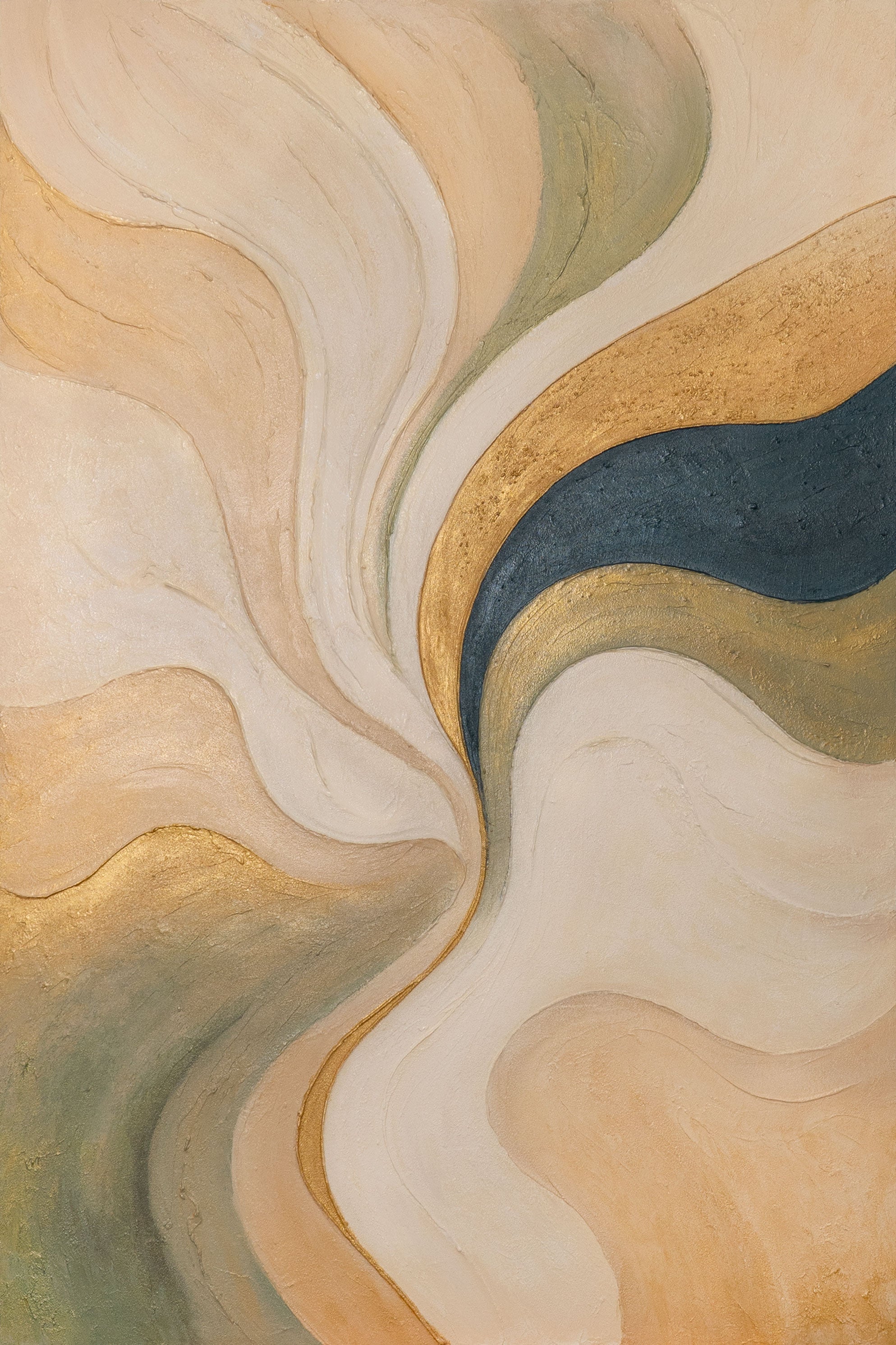 "Echo of the Wind" is a harmonious, hand-painted acrylic painting that captivates with its flowing forms and soft color transitions. Beige, Green, and Blue tones blend together, highlighted by golden accents that add elegance and radiance to the piece. The relief-like texture enhances the depth and liveliness, making it an exclusive focal point.
