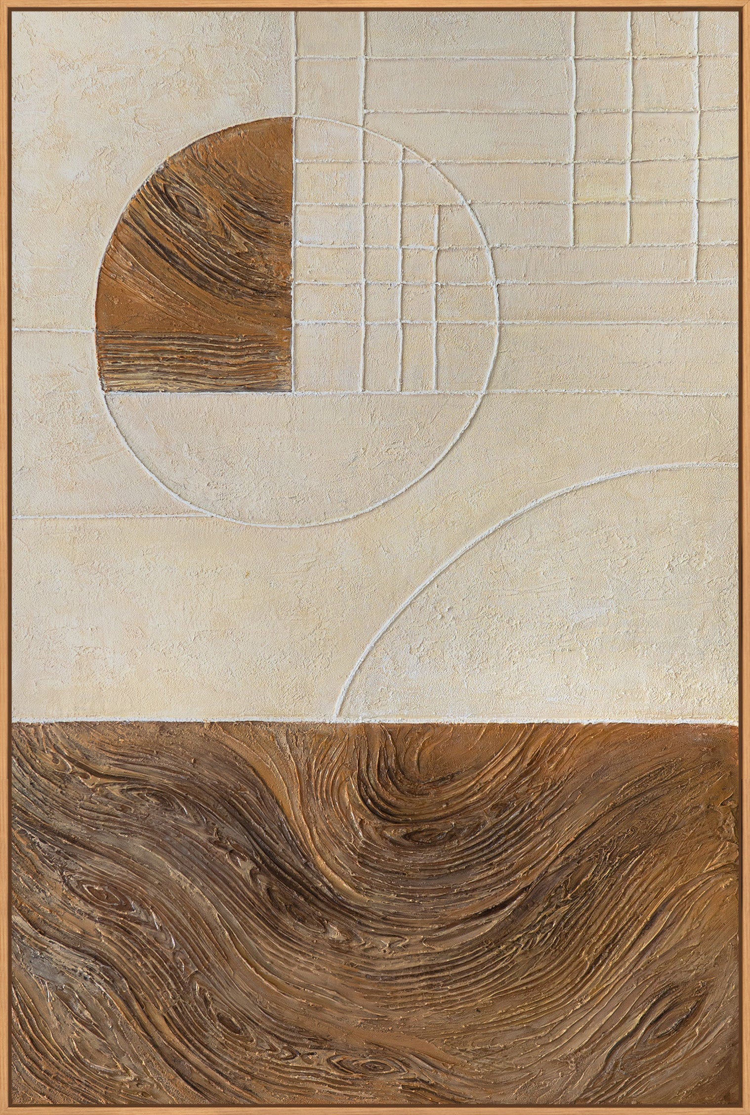 "Lines and Circles" is a hand-painted abstract painting with a clear geometric structure and a striking surface effect. Calm beige and sand tones meet a bold circular form and fine linear grids, complemented by a contrasting, relief-like texture in the lower section.