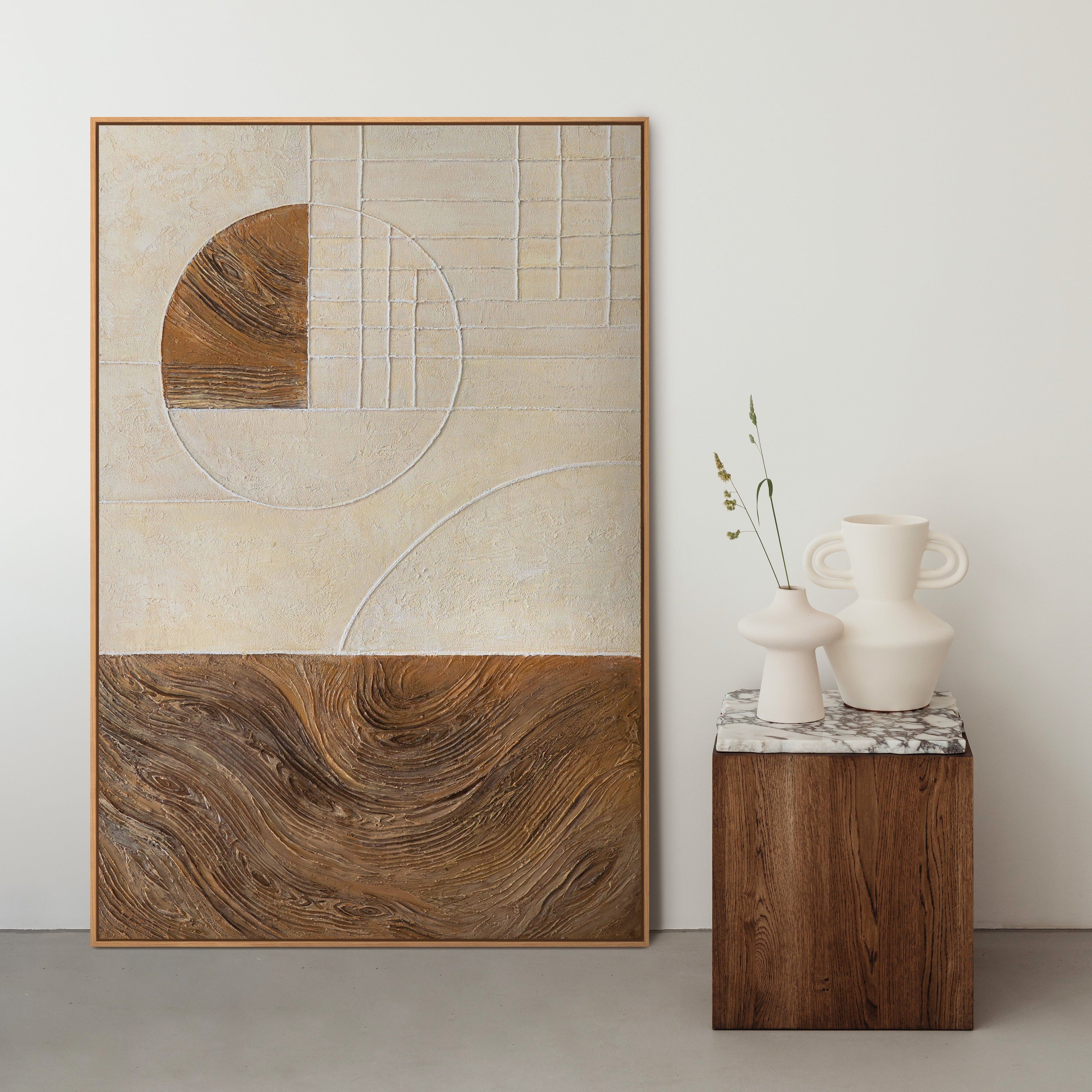 The work has a balanced, architectural feel and unfolds its effect as modern wall art in a variety of room concepts. Thanks to its neutral color palette, the painting can be combined in many ways while remaining timeless and present.