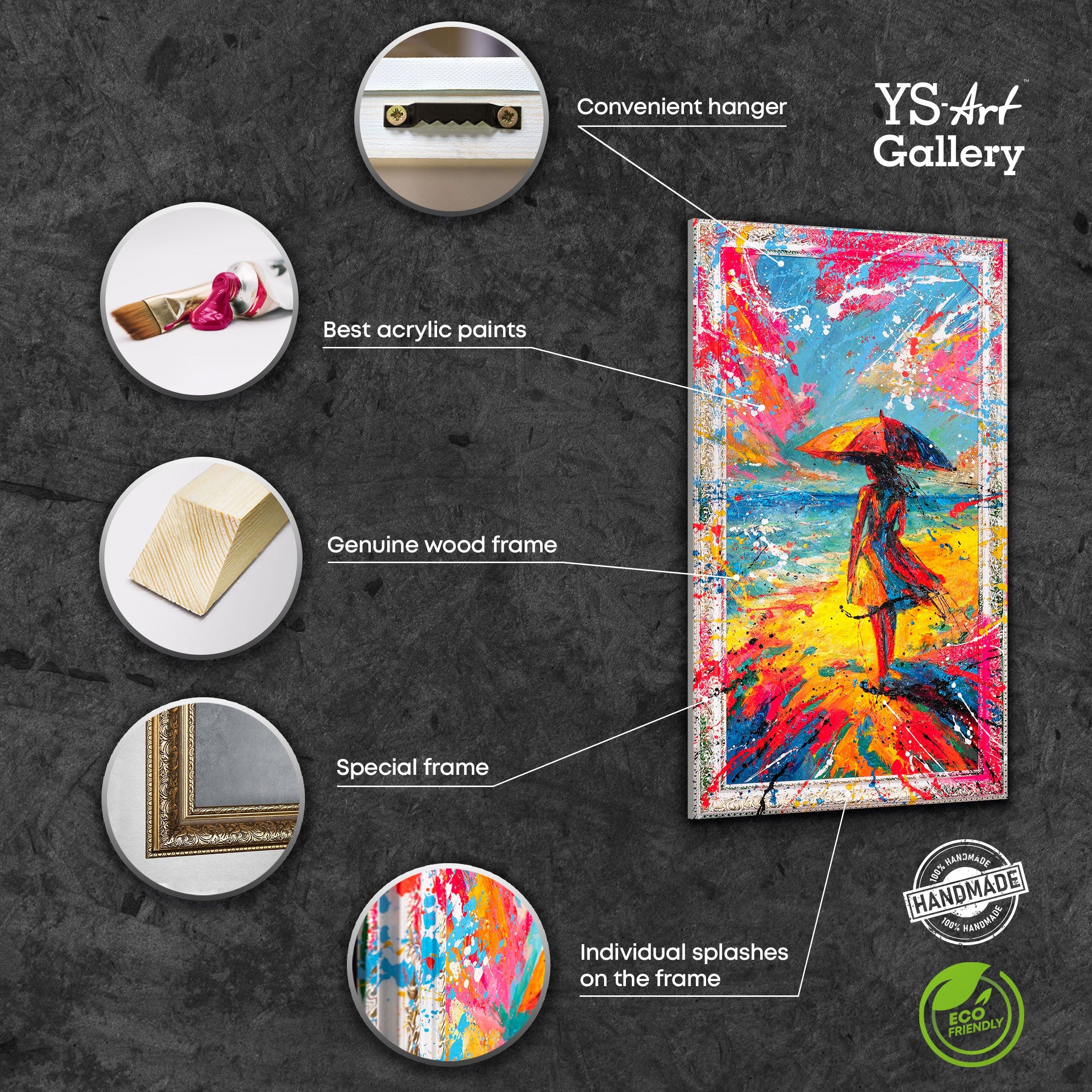 „Towards the Sun“ is a hand-painted acrylic painting full of intensity, movement, and hope. The scene depicts a woman with an umbrella by the sea, surrounded by vibrant colors that blend like sun rays and waves. The powerful color explosion in red, yellow, blue, and pink brings warmth, dynamism, and joy to your spaces.