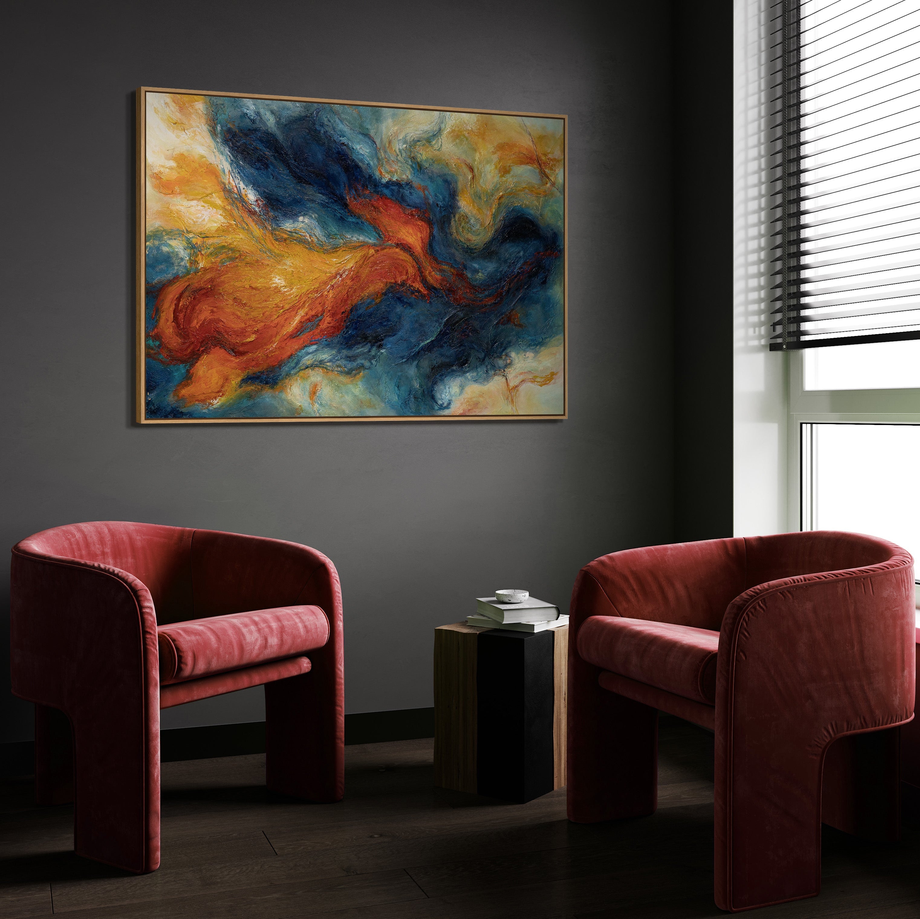 This painting is ideal for modern, creative, and expressive interiors. It acts as a dominant focal point, bringing vibrancy, dynamism, and artistic presence to living spaces, lofts, offices, or prestigious areas. "Merging of Energies" makes a clear statement and lends character to any room.