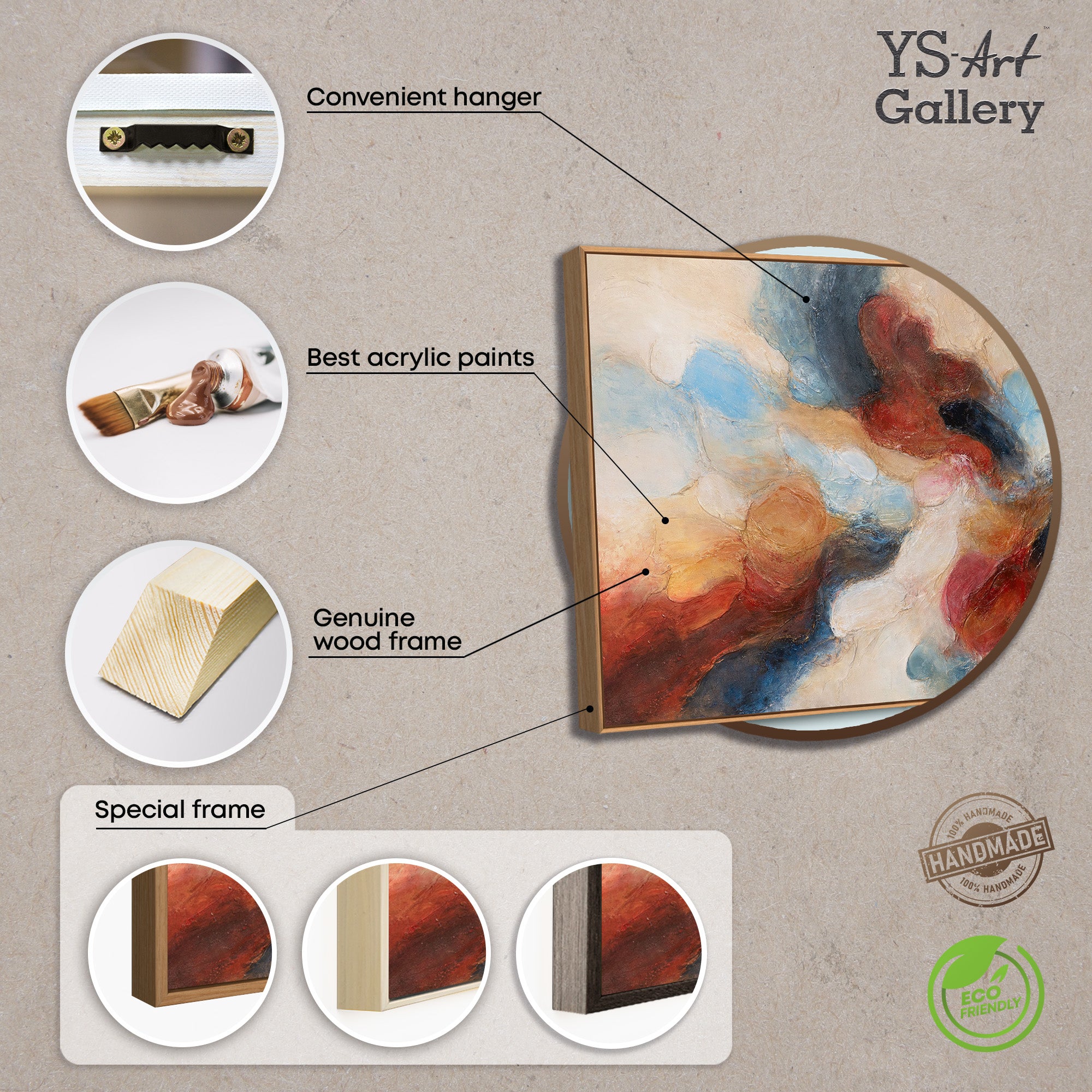 "Music in Color" is a vibrant abstract acrylic painting that creates a rhythmic visual effect through dynamic color gradients and powerful textures. Warm reds and earth tones meet cool shades of blue and cream, forming a multi-layered composition with palpable movement. The impasto surface and visible brushstrokes emphasize the hand-painted character of this artwork.