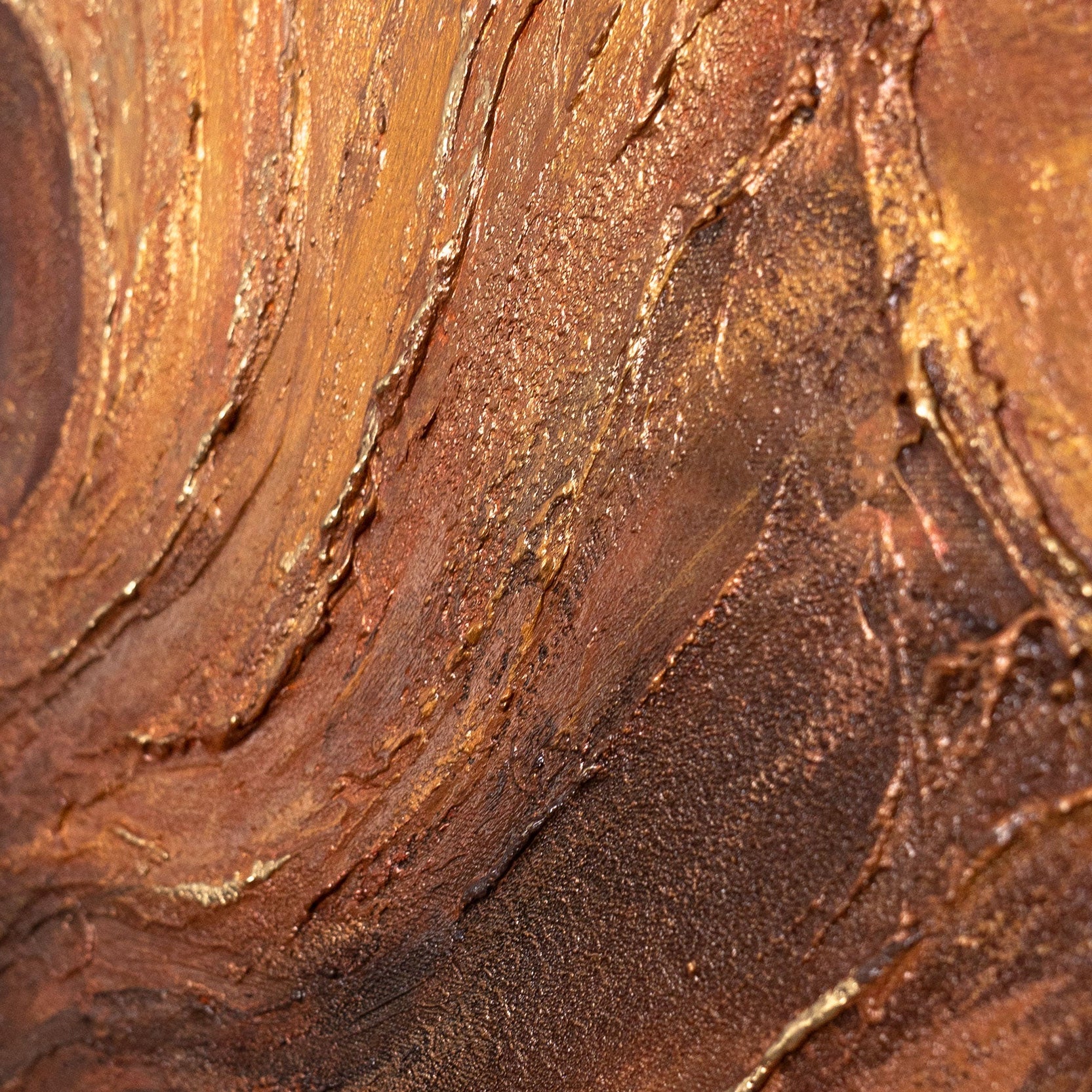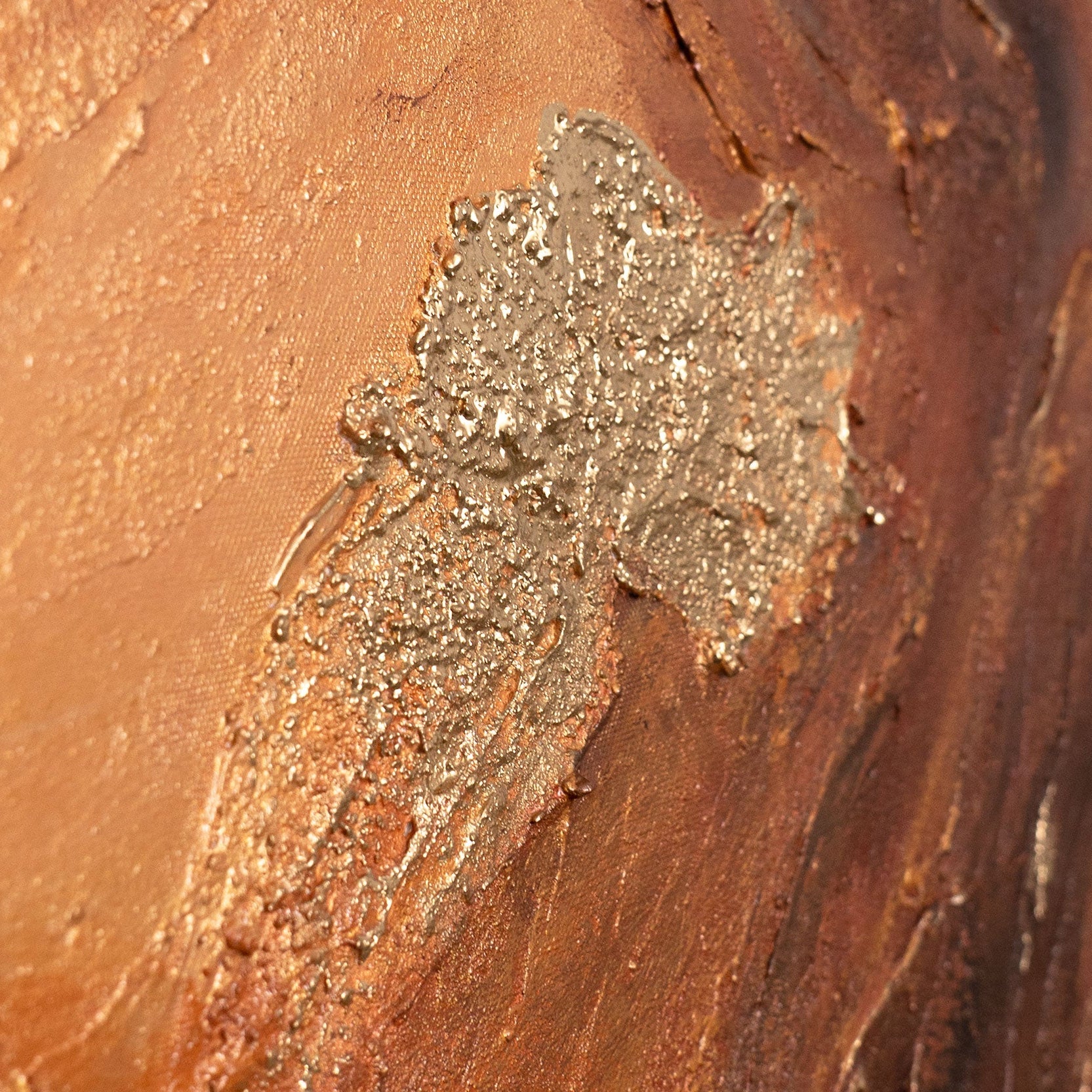 • Abstraktes Wandbild auf Leinwand in warmen Kupfertönen, Seitenansicht an der Wand
