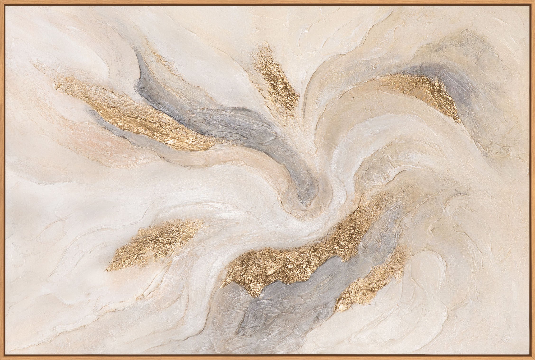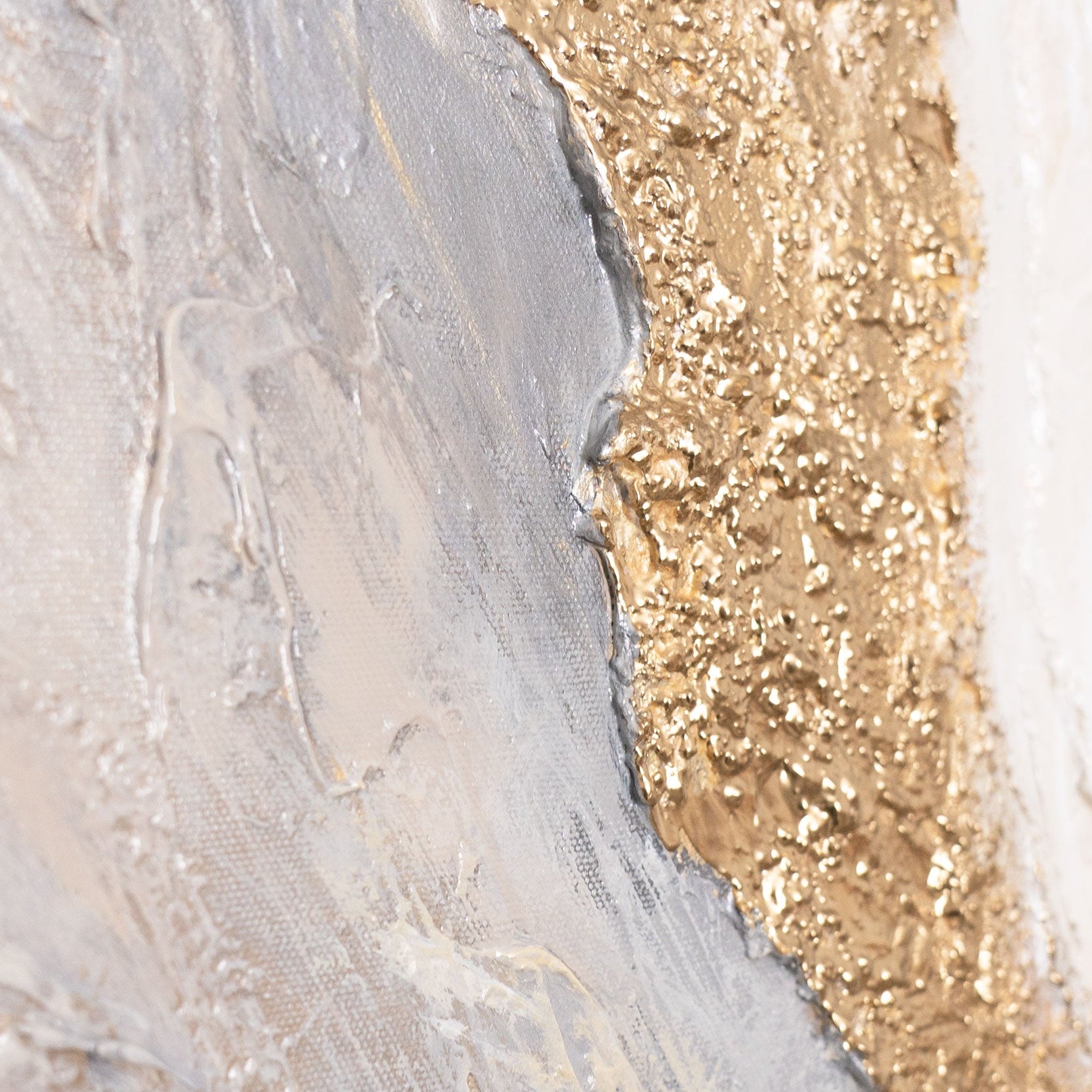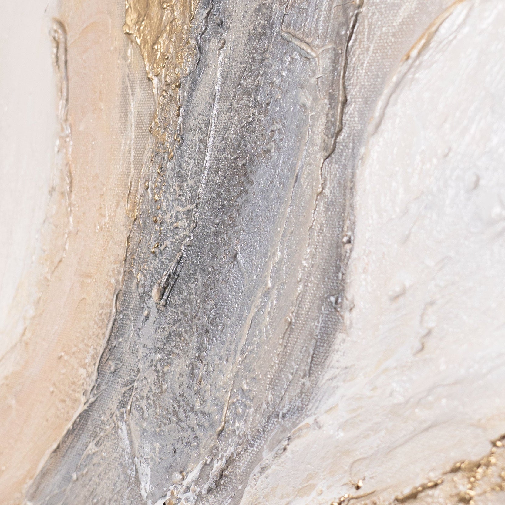 "Radiant Streams" is an elegant abstract acrylic painting that captivates with its flowing forms, soft transitions, and refined gold accents. Soft beige and cream tones blend with gray and textured gold elements to create a harmonious and serene composition. The relief-like surface lends the artwork depth and a high-quality, hand-painted character.