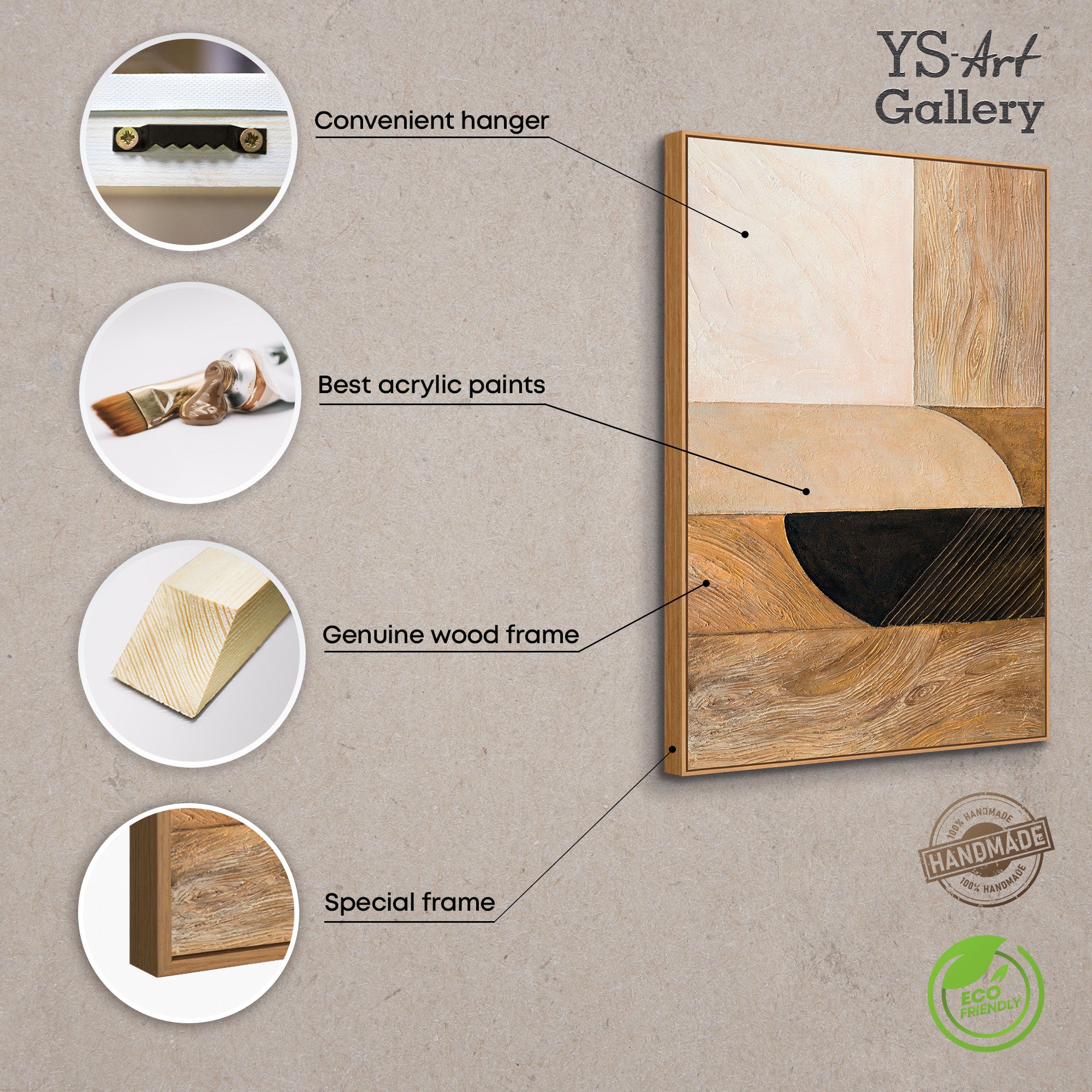 Dieses Kunstwerk verbindet natürliche Farbwelten mit moderner Geometrie und handwerklicher Textur und ist ideal für alle, die authentische, handgemalte Kunst mit klarer Formensprache suchen.