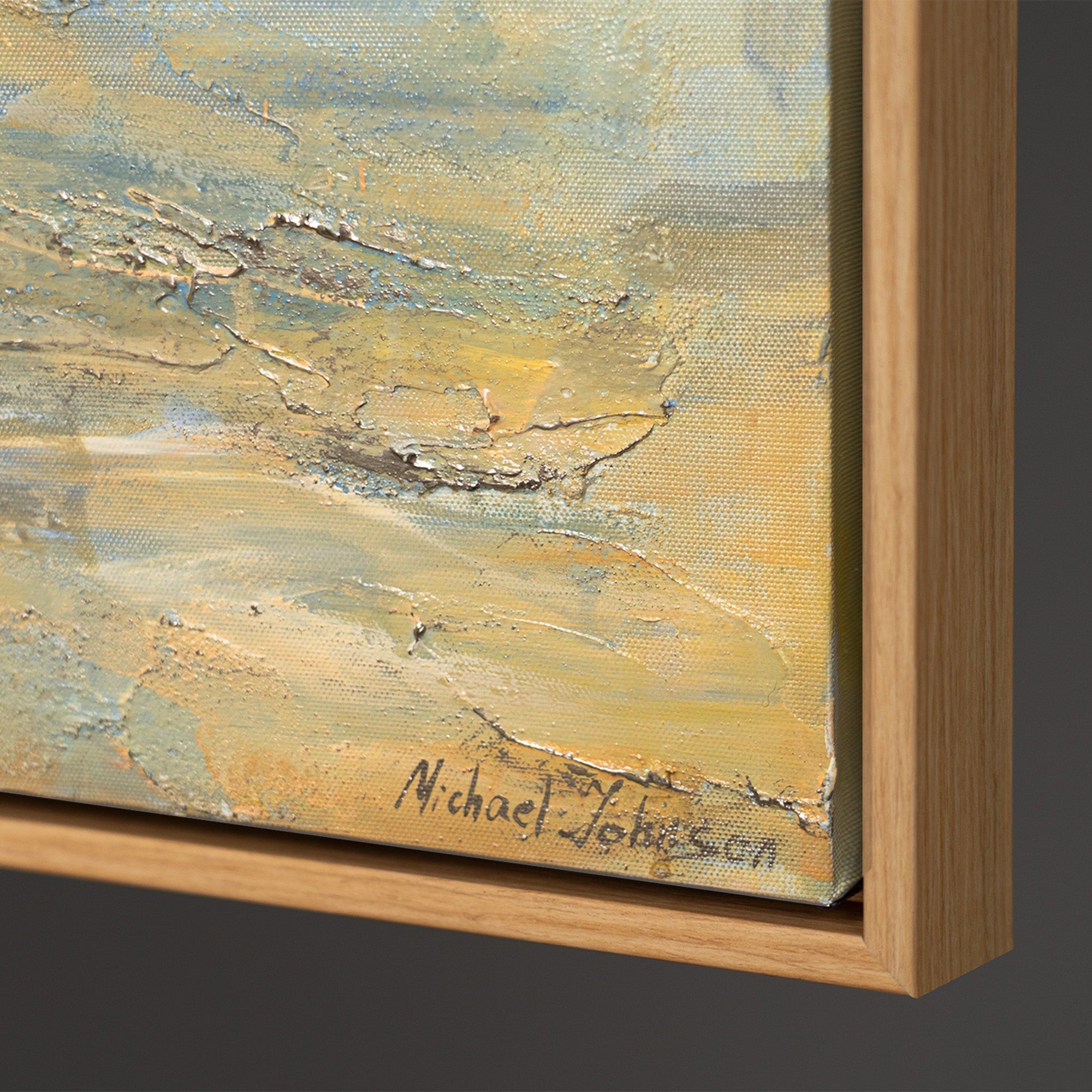 Painted on canvas and stretched over a solid wooden stretcher frame, this framed wall art features layered texture that enhances the play of light across the surface. A protective water-based varnish is applied to help preserve colour balance and surface quality over time.