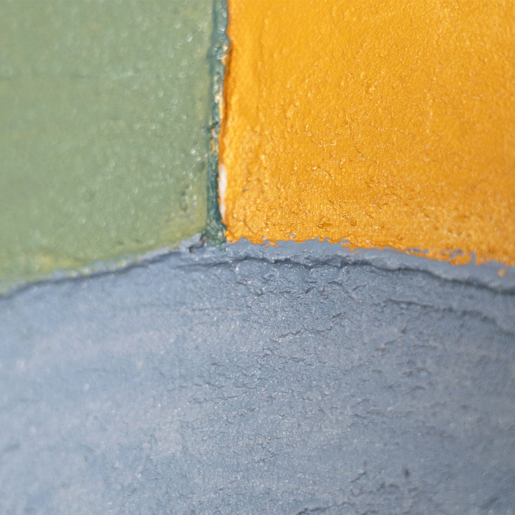 „Warme Geometrie“ ist ein handgemaltes Acrylgemälde, das durch seine klare geometrische Struktur und kräftige Farbflächen beeindruckt. Rechtecke in Orange, Grün, Gelb und Braun rahmen eine zentrale, kreisförmige Fläche in Blau ein. Die lebendige Farbwahl und die pastose Struktur verleihen dem Werk einen modernen, künstlerischen Ausdruck.