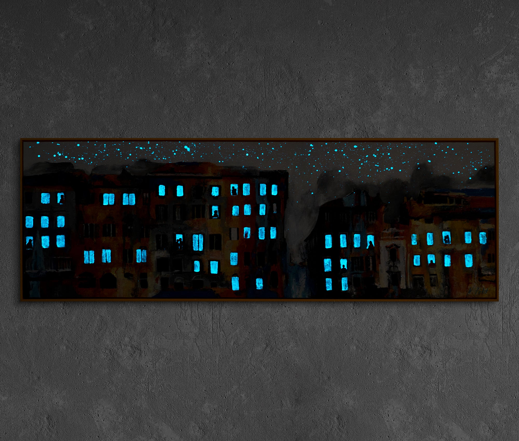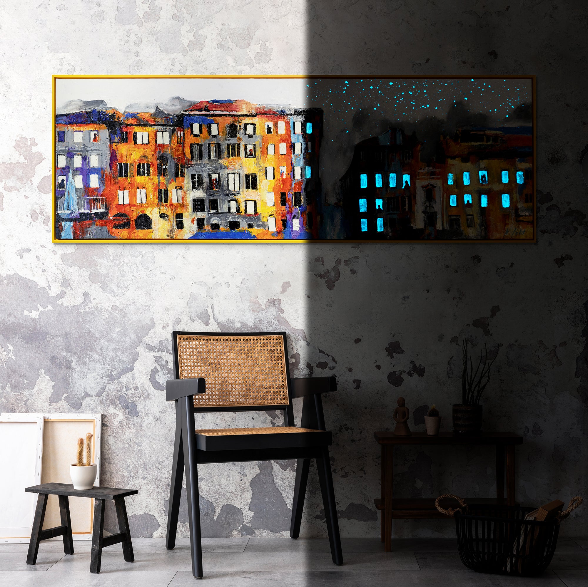 - During the day, this is a textured motif with a pleasant color scheme, and at night it creates a soft, pleasant glow of light that gives your room a unique comfort. So you not only get a glow in the dark wall painting, but also pleasant colored night lighting for your interior.