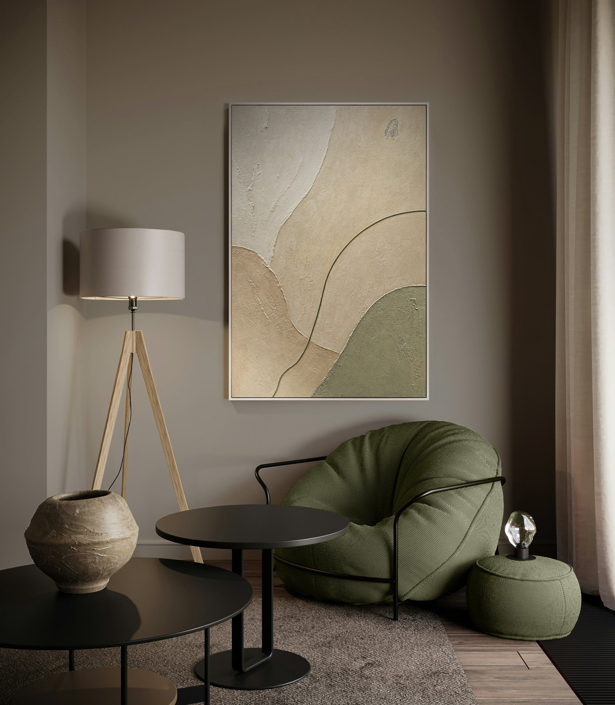 This hand-painted acrylic painting with a textured finish is ideal for modern, Scandinavian, and minimalist interiors. Its natural color palette of beige, cream, and soft green creates a warm, earthy atmosphere. Made in Germany with meticulous attention to detail, securely packaged, and with free shipping – art that exudes serenity.