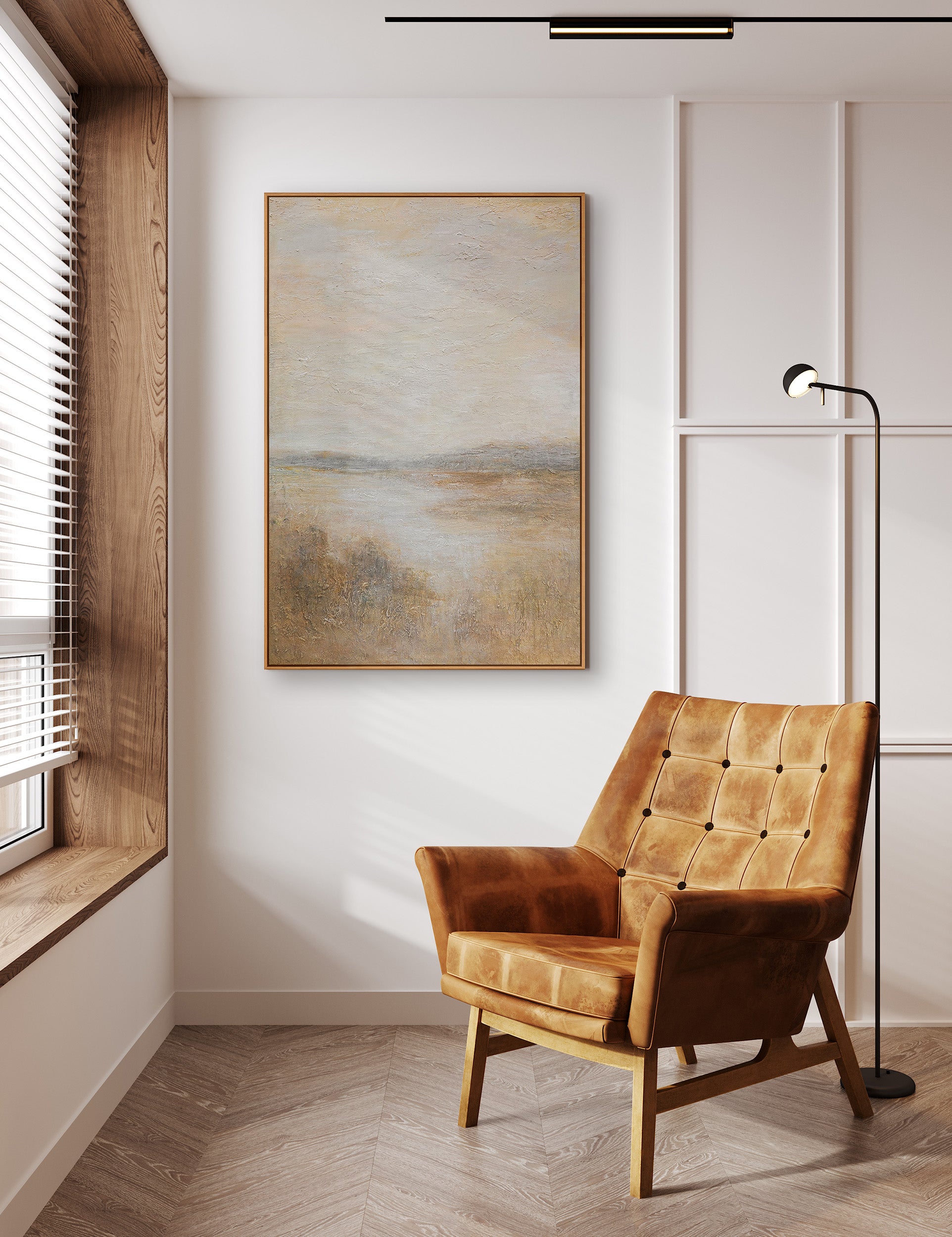 "Misty Morning" captures the quiet poetry of a dawning day. Soft beige tones, subtle shades of gray, and delicate reflections of light create an atmospheric landscape that conveys both tranquility and depth. The textured surface lends the artwork a tangible feel, as if mist were drifting across a vast plain.