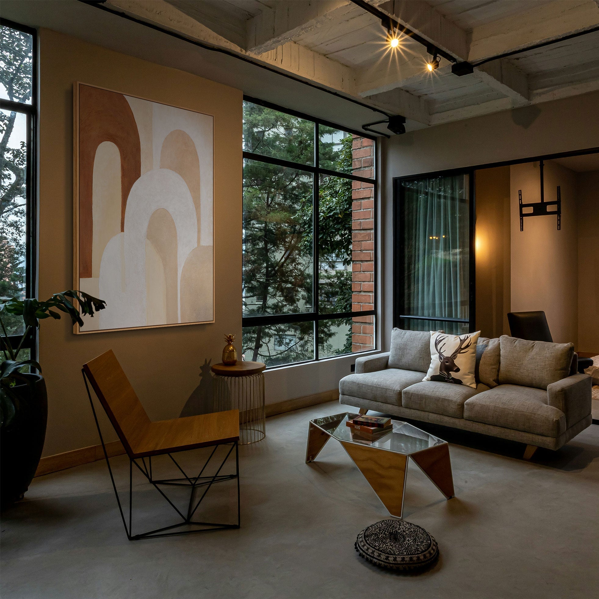 „Atem der Architektur“ vereint geometrische Strenge mit weicher Harmonie. Organische Rundbögen in warmen Beigetönen verschmelzen mit erdigen Braunnuancen und schaffen eine ruhige, architektonische Balance. Die strukturierte Oberfläche bringt Licht und Schatten zum Leben – wie eine Hommage an mediterrane Formen und Materialität.