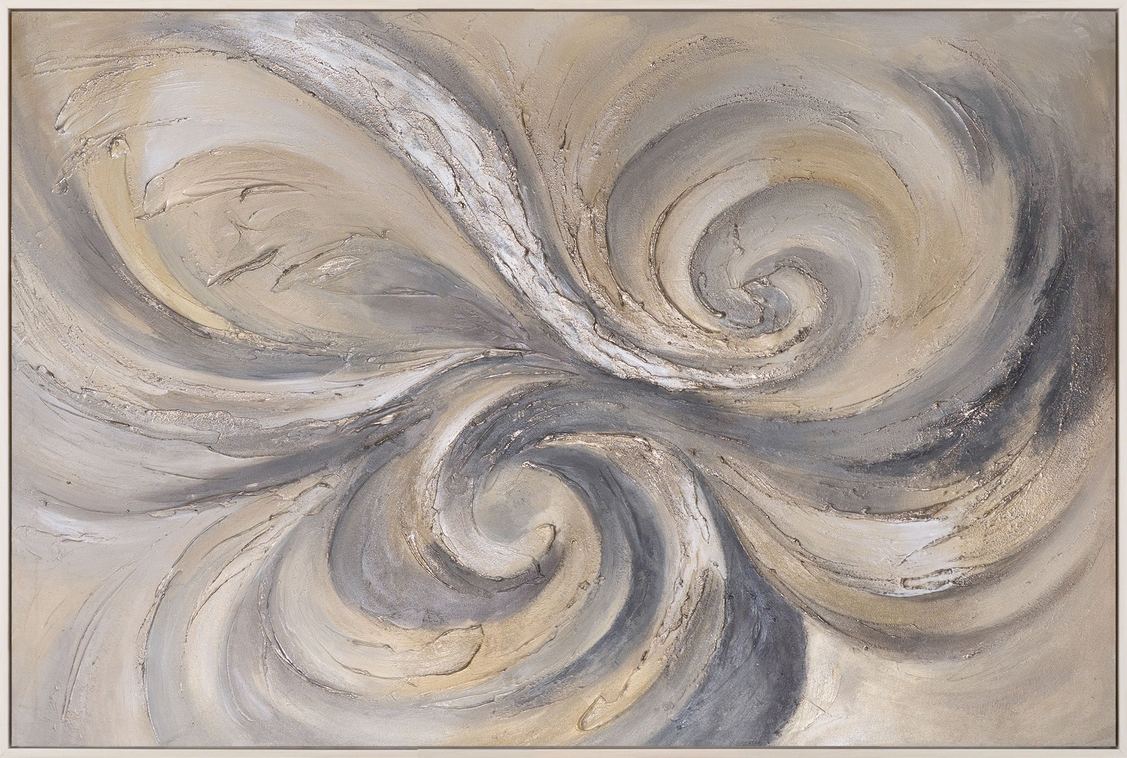 „Sand und Wolken“ ist ein harmonisches abstraktes Acrylgemälde, das durch weiche Wirbelbewegungen, fließende Übergänge und eine beruhigende Farbpalette überzeugt. Sanfte Beige-, Creme- und Grautöne verschmelzen zu einer luftigen Komposition mit spürbarer Struktur und handgemaltem Charakter.