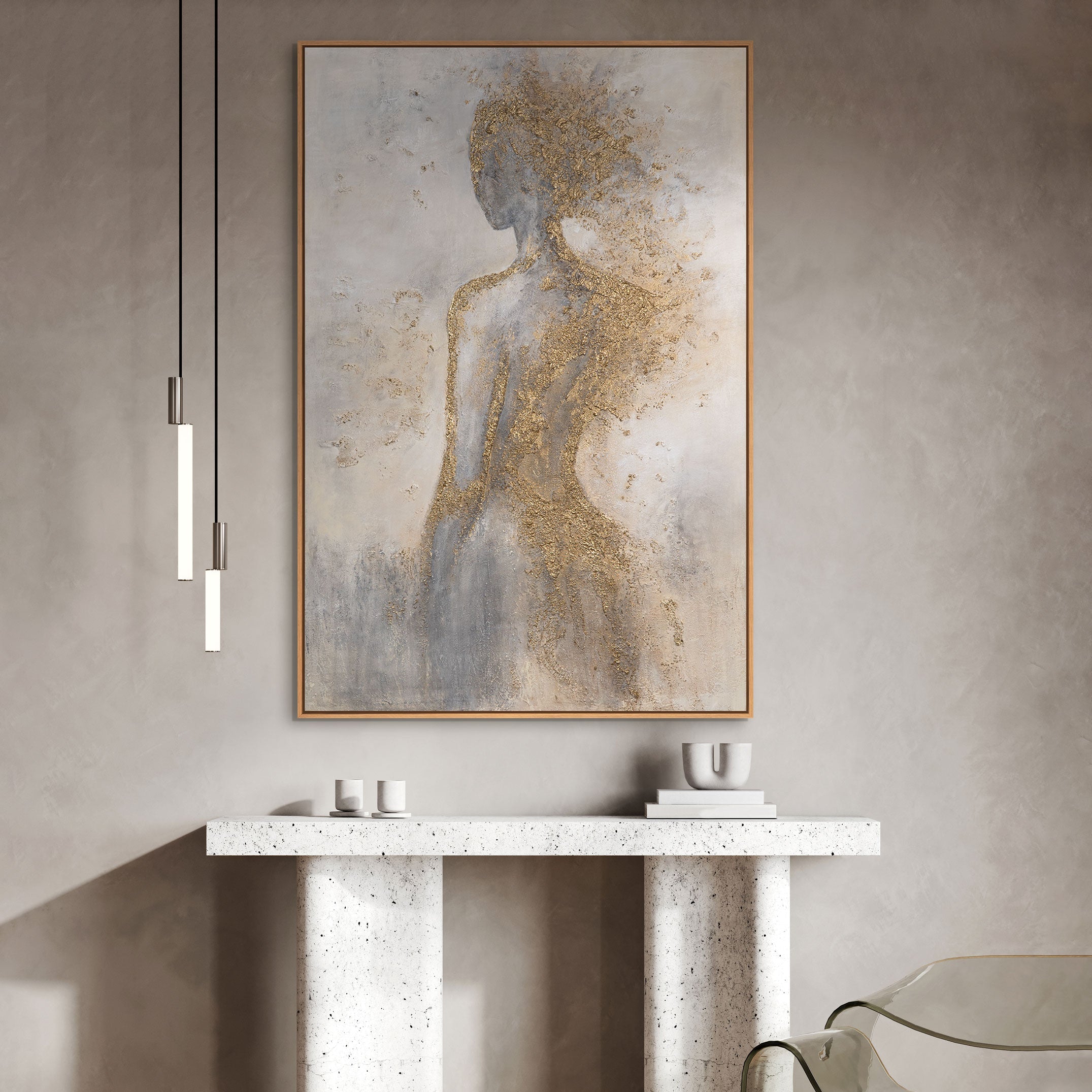 This figurative abstract painting captures a refined human presence through subtle form, texture and light. Silent Grace presents a softly defined female silhouette enriched with delicate gold accents, creating a composition that feels calm, elegant and emotionally resonant. The vertical format enhances the sense of poise, making it a sophisticated choice for living room artwork or serene interior spaces.