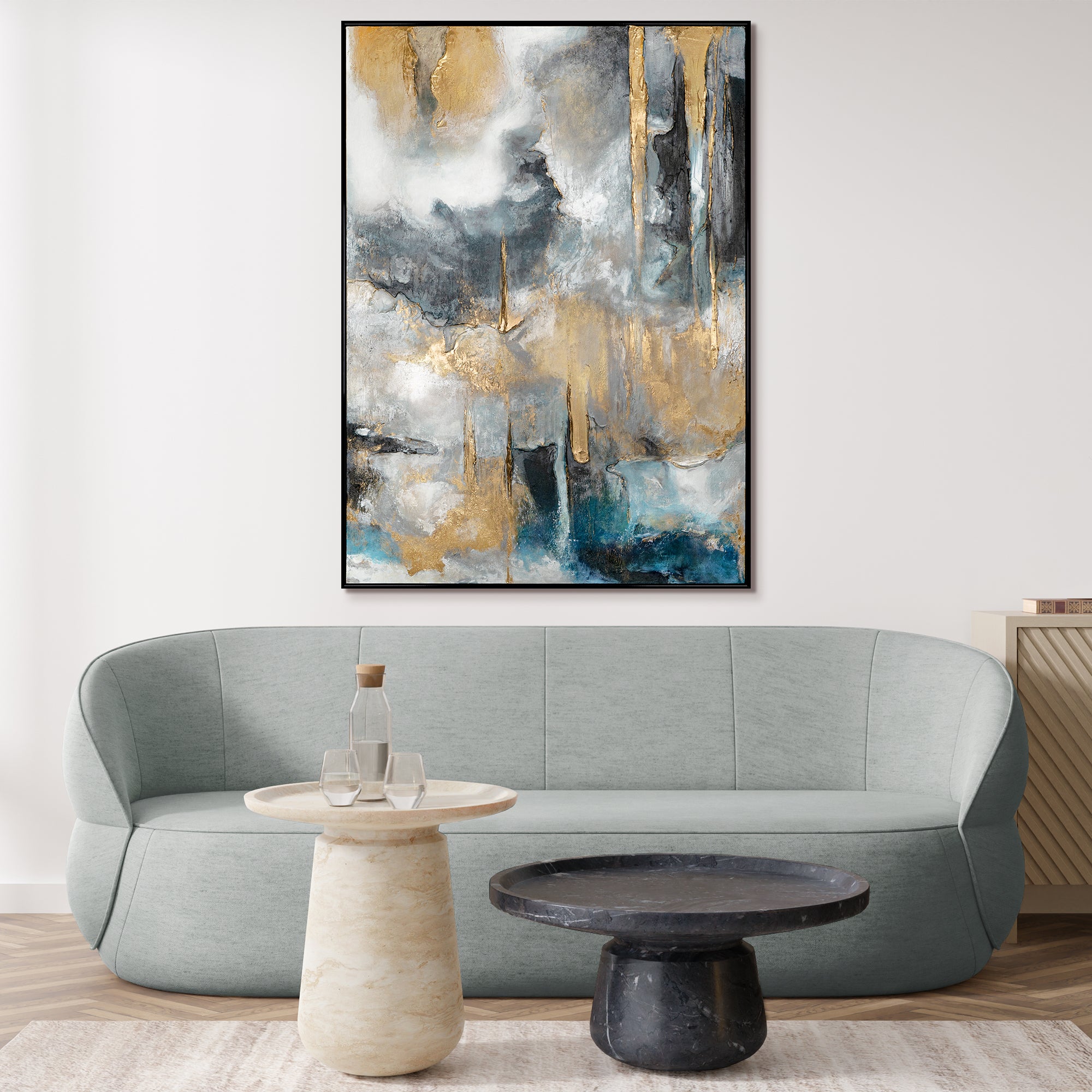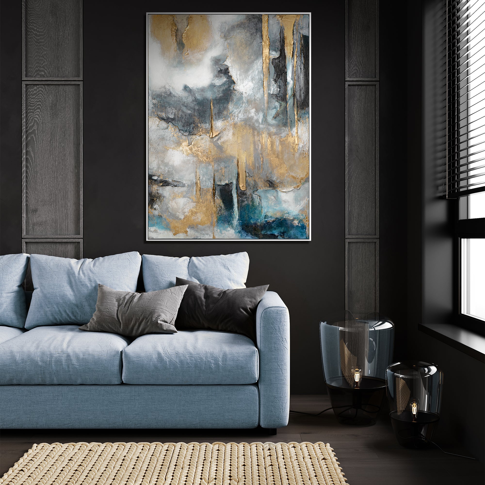 Enrich your home or office with this elegant abstract artwork, featuring a dynamic and modern composition in golden and blue tones. The image captivates with bold contrasts and expressive brushstrokes. It is 100% hand-painted and is highlighted by an elegant frame.