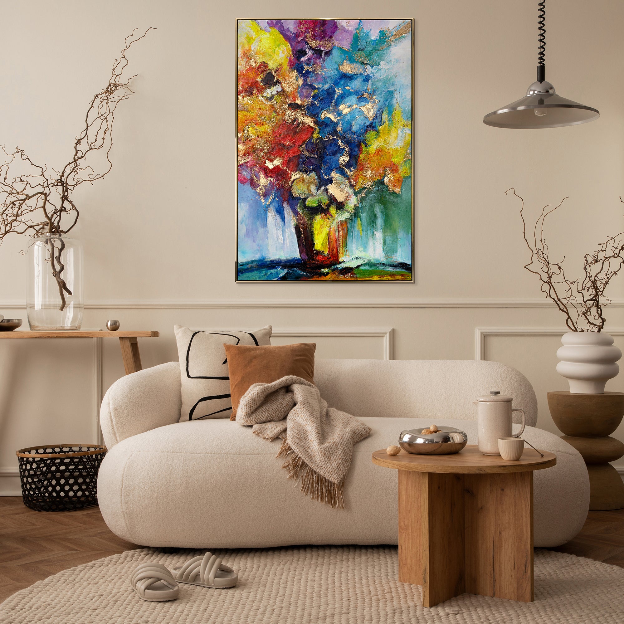 Enrich your home with this colorful framed modern abstract art that captures the beauty of nature in vibrant colors. The painting features intense hues and expressive brushstrokes. It is 100% hand-painted and highlighted by an elegant frame.