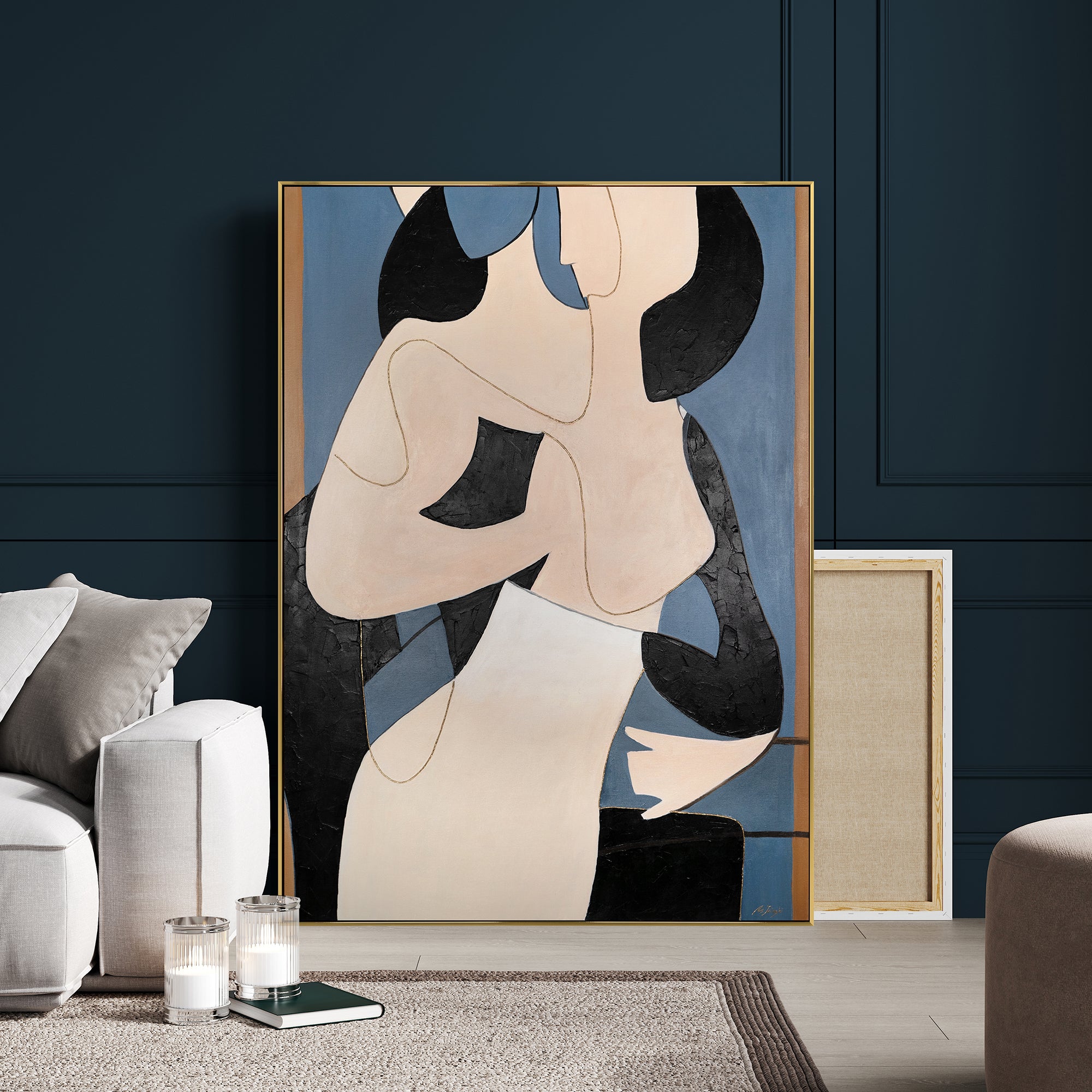 Immerse yourself in the world of abstract elegance with our hand-painted large abstract wall art. This one-of-a-kind piece features two enigmatic figures, masterfully rendered in a symphony of colours that will captivate and inspire. Each stroke on the canvas is applied with meticulous attention to detail, showcasing the artist's passion and skill.