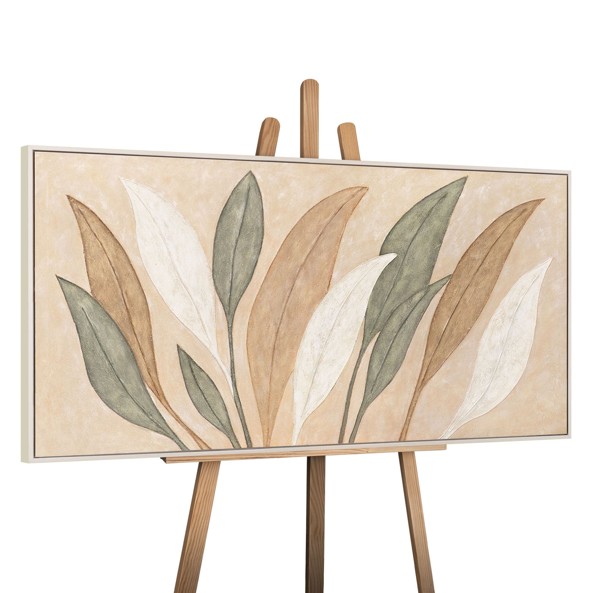 Bring the beauty of nature into your home with the hand-painted canvas painting "Dance of the Leaves." Soft earth tones in Beige, Brown, and Green blend harmoniously with clear lines and a textured surface. The elegant composition conveys tranquility and naturalness, while the organic leaf shapes exude timeless lightness.