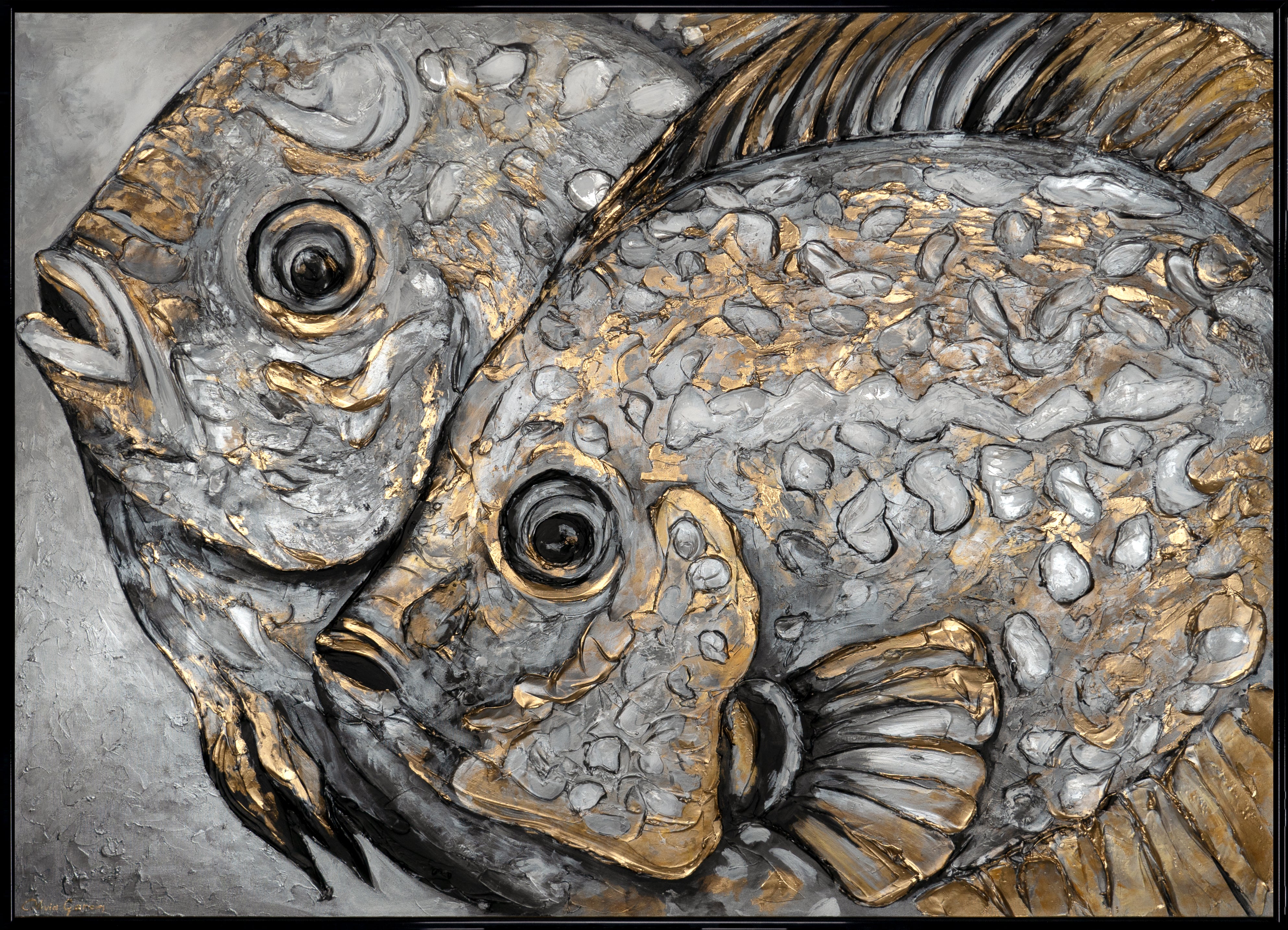 This extraordinary artwork captures a mysterious, almost mythical atmosphere with two intertwined fish in gold and gray tones. The heavily textured surface is created using thick acrylic paste and metallic accents, which playfully reflect light. Every brushstroke is palpable, giving the composition a vivid, three-dimensional depth.
