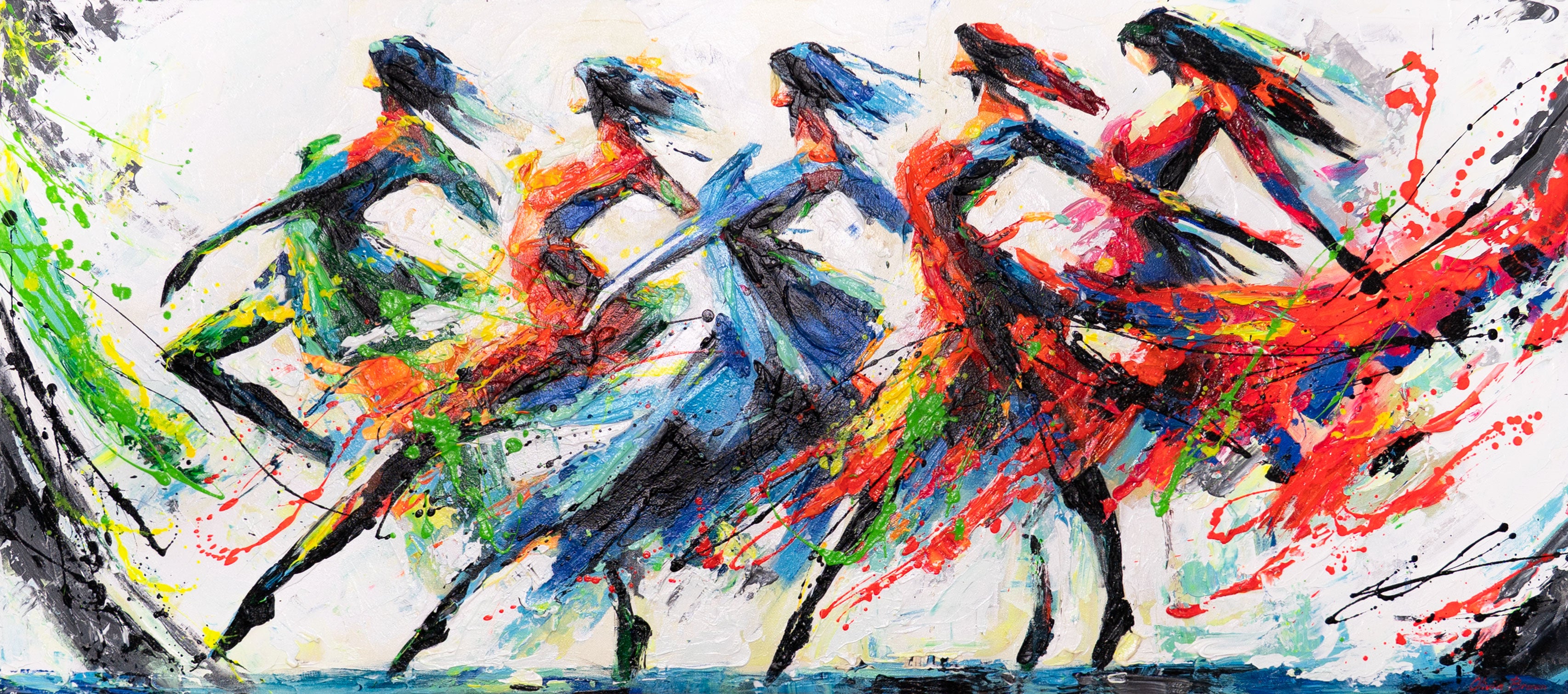 This artistic acrylic painting captures the elegance and vibrancy of dancing women in explosive hues. The abstract brushstrokes in red, green, blue, and yellow give the piece dynamic movement and strong emotional expression.