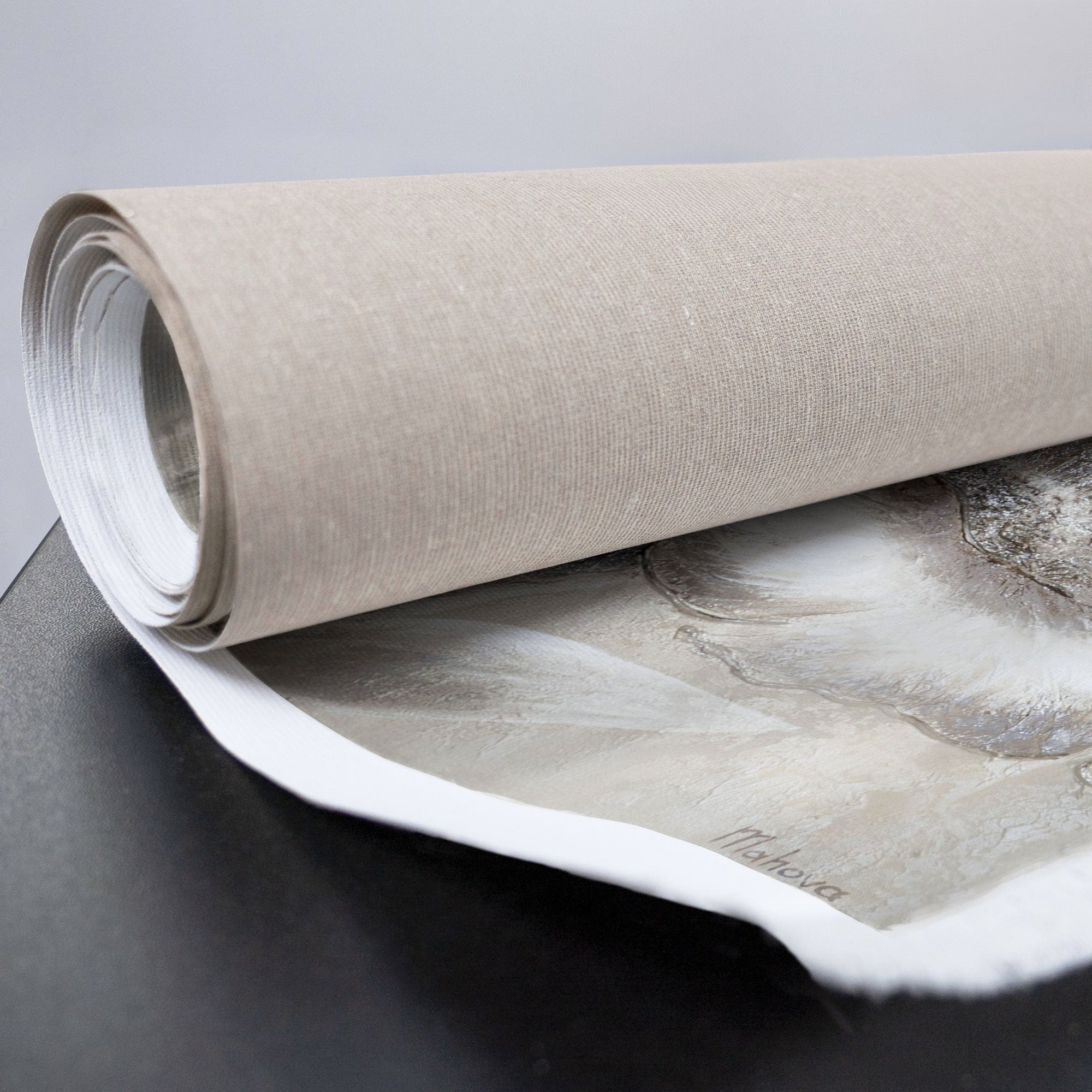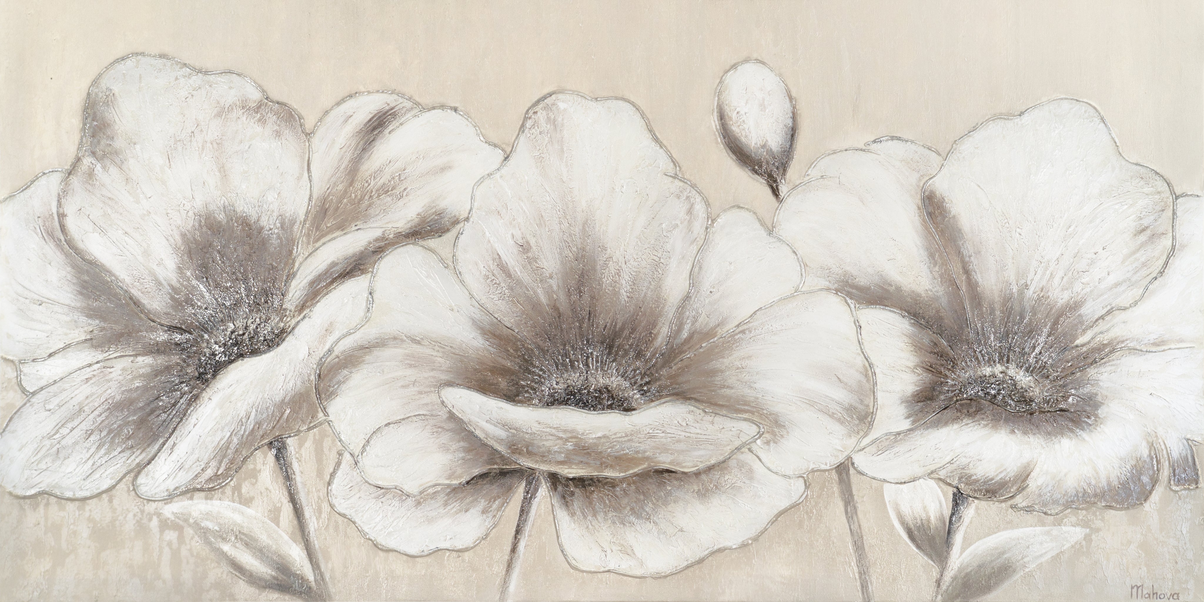 The hand-painted acrylic canvas "Flowers II" features a delicate composition of large blooms in soft beige and white tones. The textured surface with thick layers of paint gives the floral artwork a lively three-dimensional effect and depth. This elegant floral painting brings calm, sophistication, and natural beauty to any space.