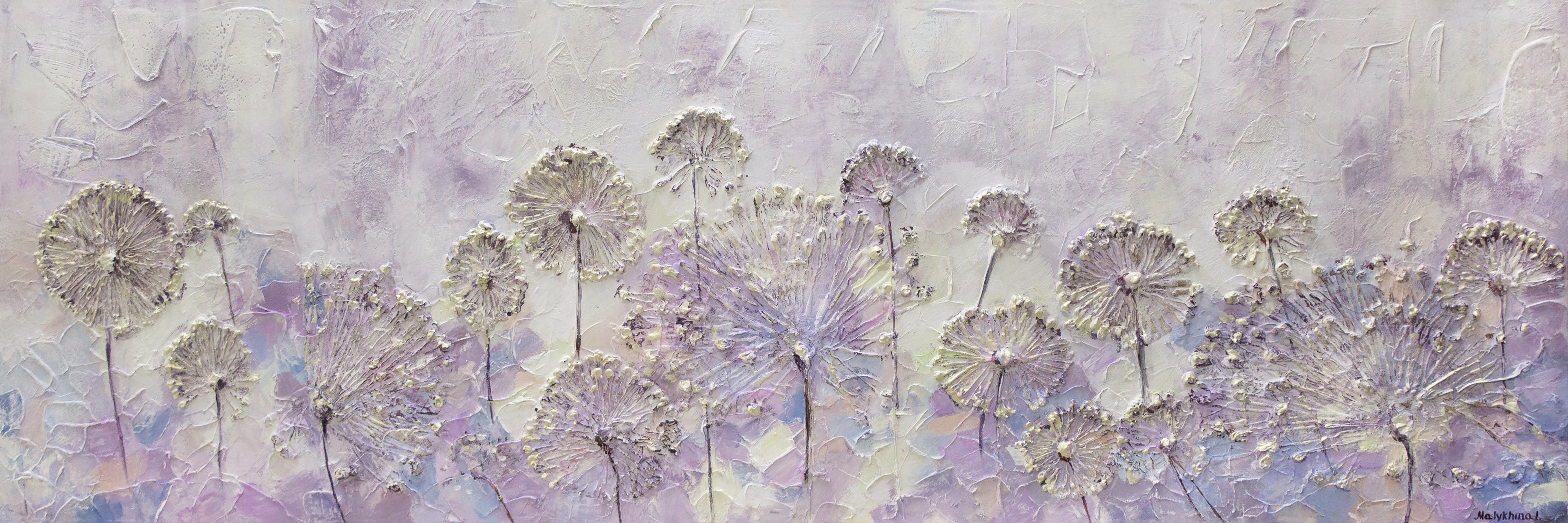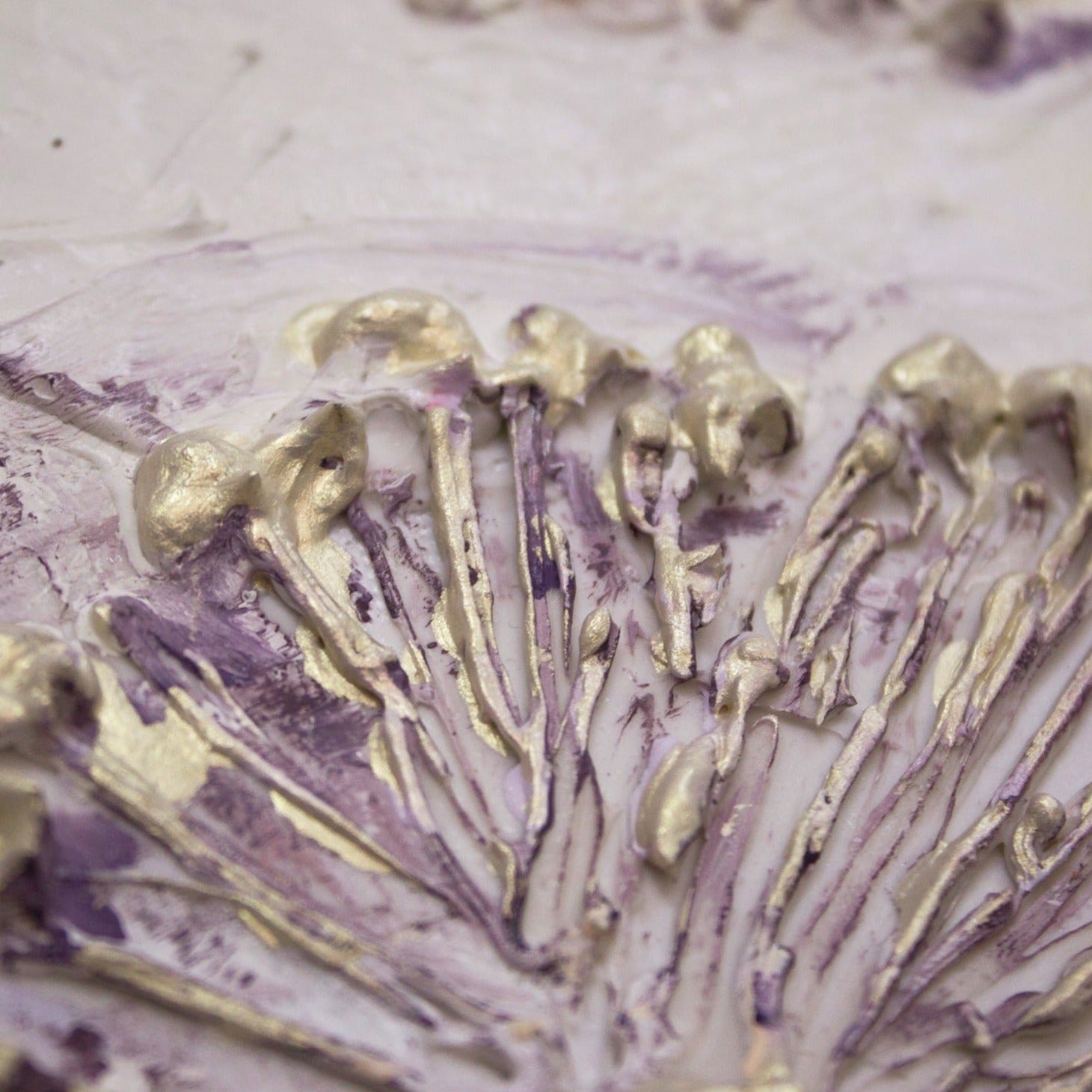The acrylic painting „Spring Awakening“ depicts delicate blossoms in soft lilac shades, brought to life with impasto technique and subtle gold accents. The harmonious composition adds tranquility and elegance to any room.