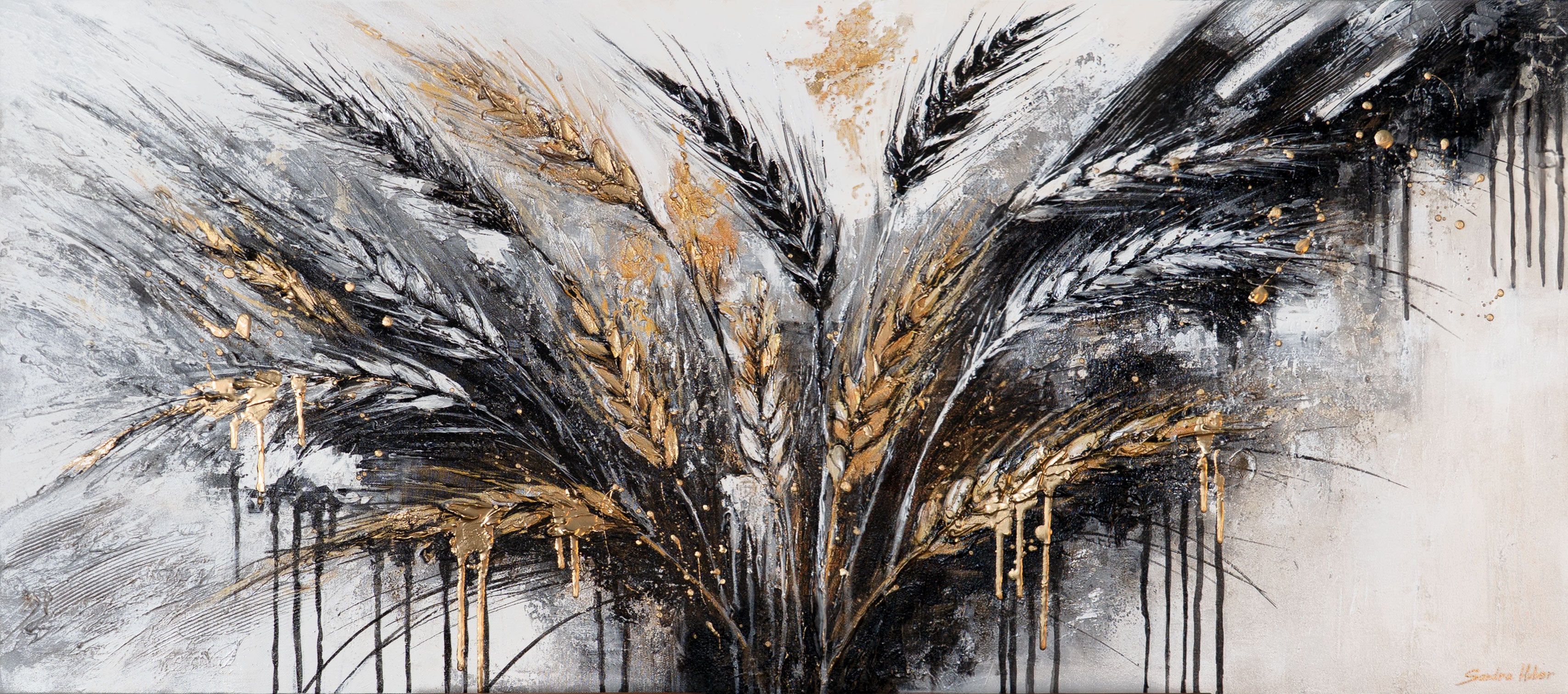 "Thorns" is a hand-painted acrylic artwork featuring a modern arrangement of golden ears of grain, immediately captivating with its depth and dynamism. The combination of black, white, and shiny gold tones creates an elegant play of structure, movement, and contrast.