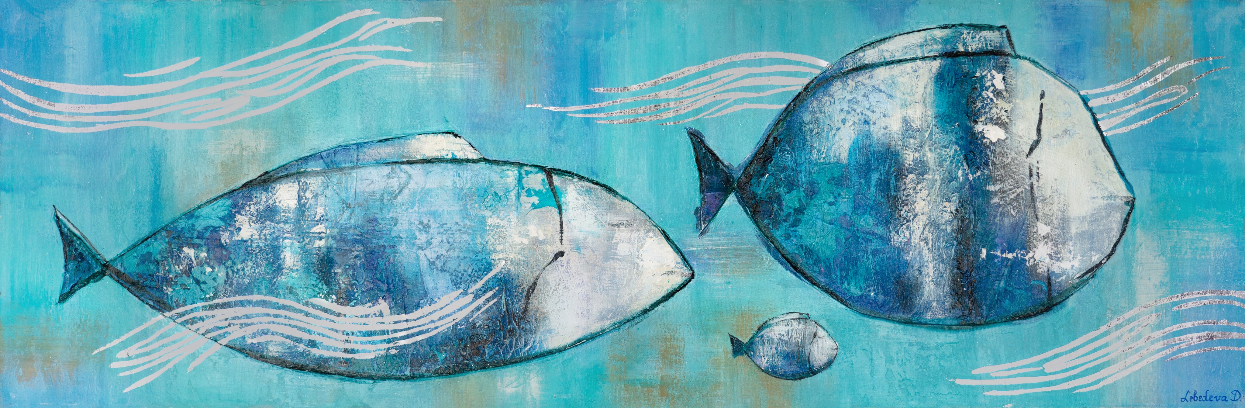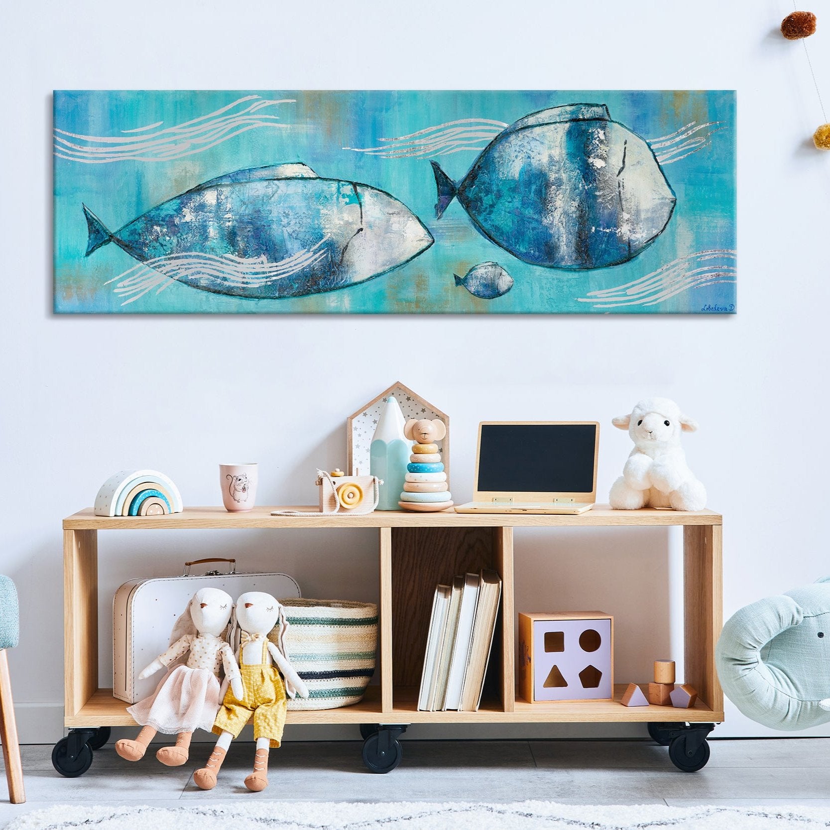 • Handgemaltes Acryl-Leinwandbild mit blauen Fischen