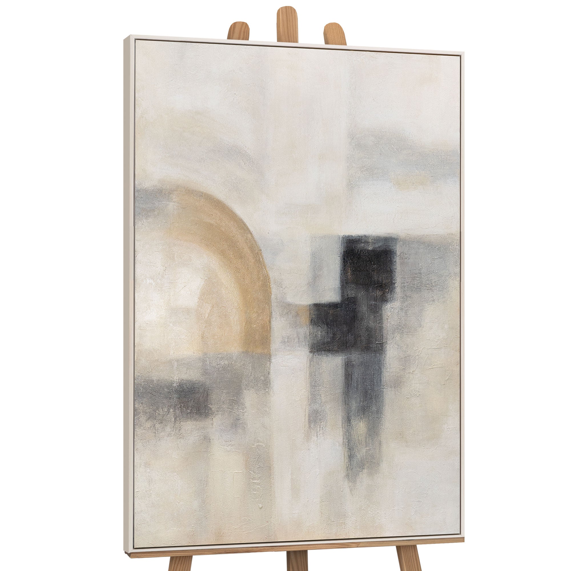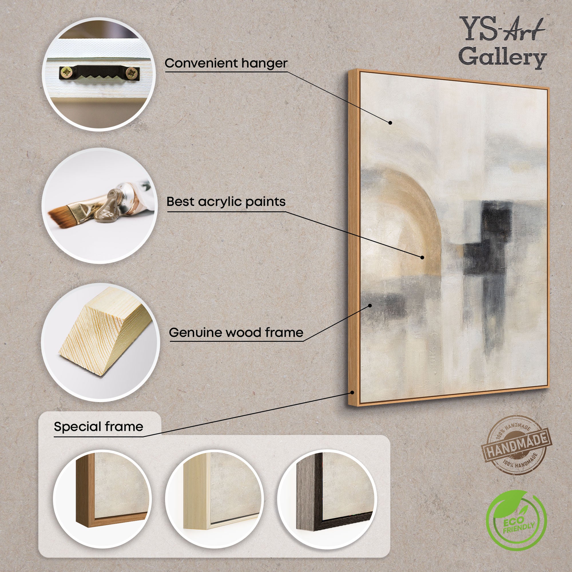 "Ghostly Light" is a hand-painted acrylic painting on canvas, known for its soft, minimalist color design. Subtle shades of Beige, Gray, and Cream form a harmonious base, while geometric hints and a semi-circular accent in Gold-Brown add depth and balance to the painting. The textured surface enhances the sensual radiance, making each piece a one-of-a-kind work of art.