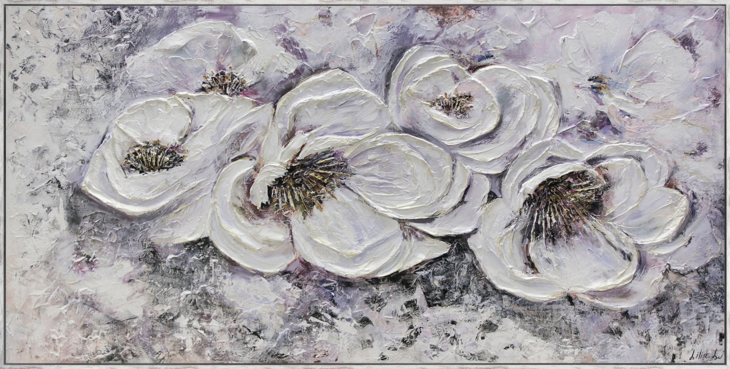 This hand-painted acrylic painting on canvas features modern floral art in delicate shades of white and purple. The detailed blossoms appear almost three-dimensional, lending the artwork impressive depth and texture.