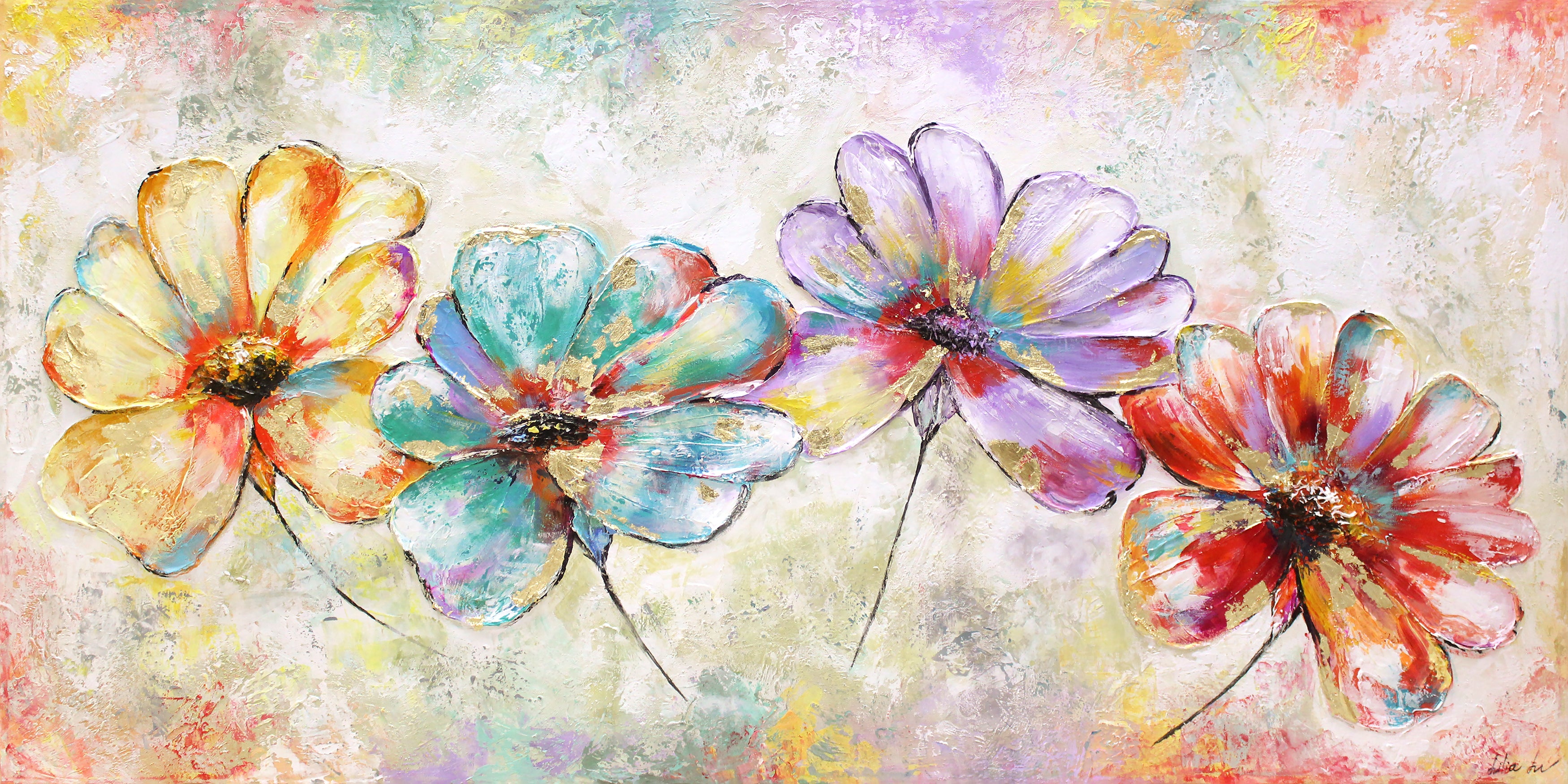 The hand-painted acrylic canvas "Beautiful Flowers" features a vibrant and playful floral meadow, full of lively colors and dynamic brushstrokes. Its textured surface enhances the depth and hand-crafted quality, creating a cheerful and welcoming atmosphere. This artwork combines artistic originality with a fresh, nature-inspired motif.