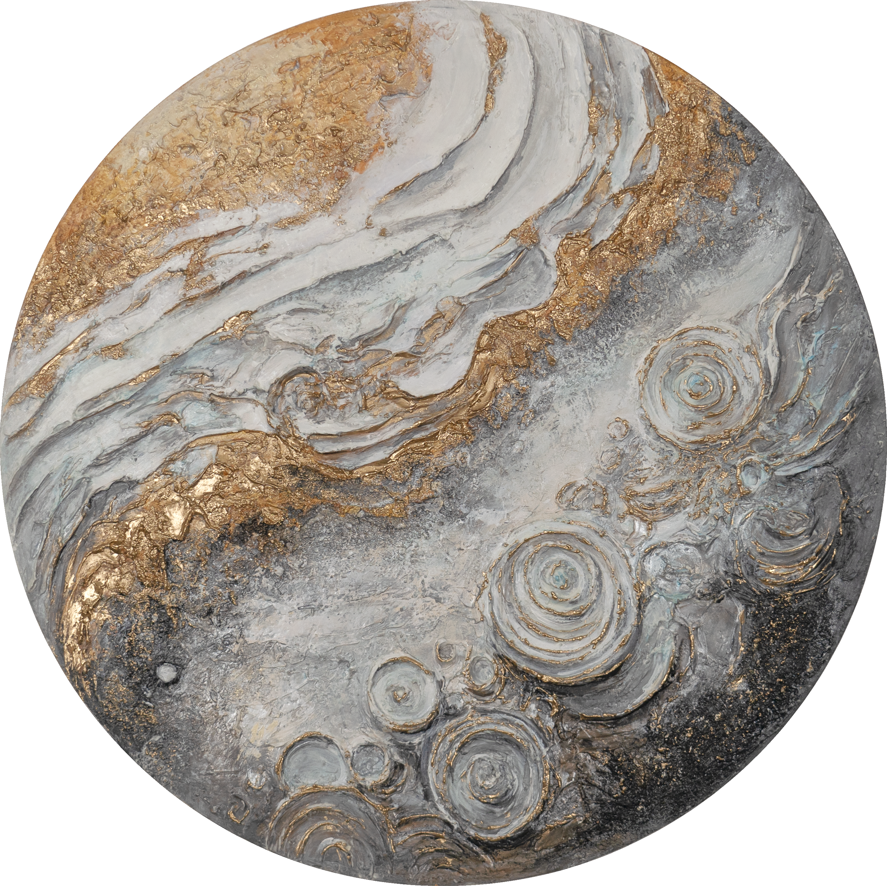 The "Sirius" painting delivers contemporary elegance through its round format and abstract textures. This original artwork glows with vibrant tones, making it a perfect choice for stylish offices or refined home interiors. Hand-painted and full of energy.