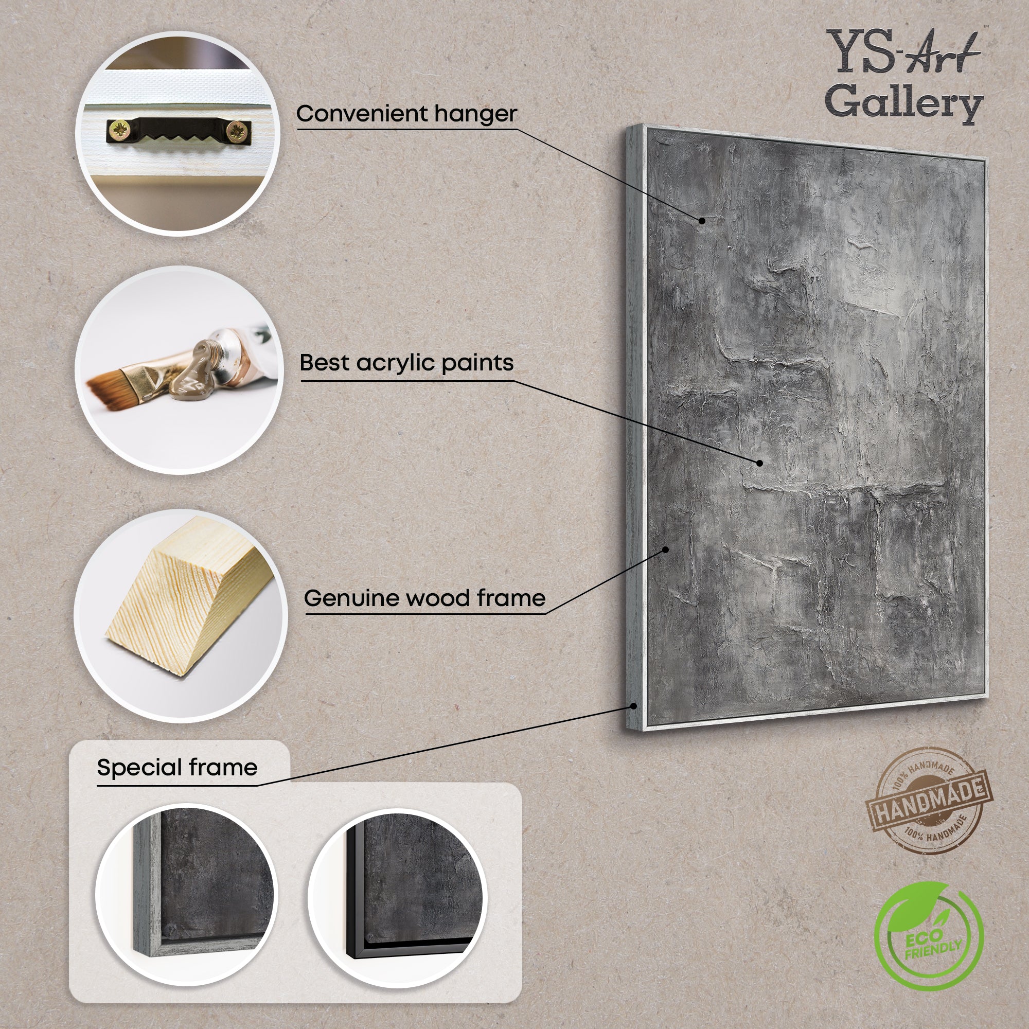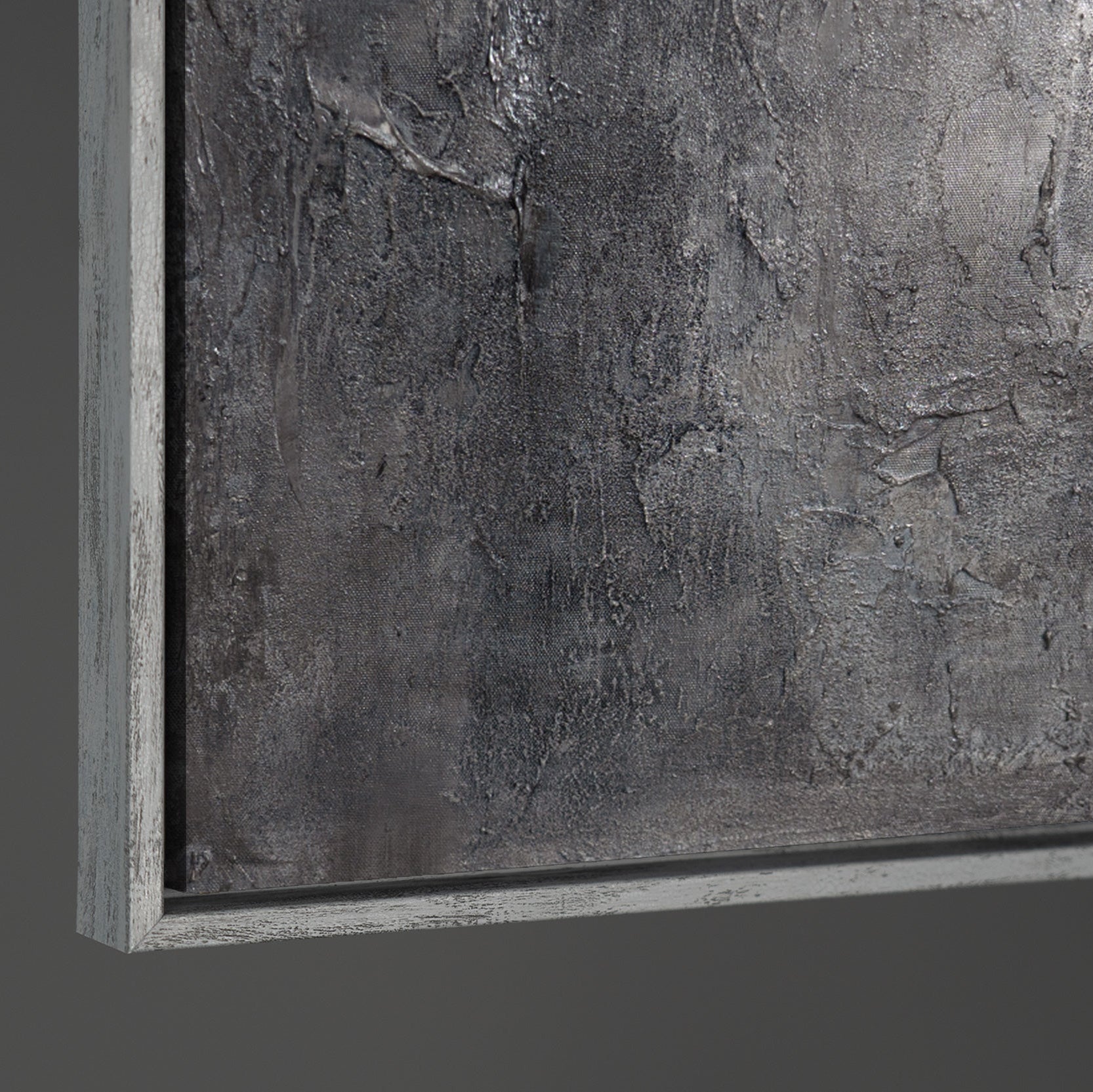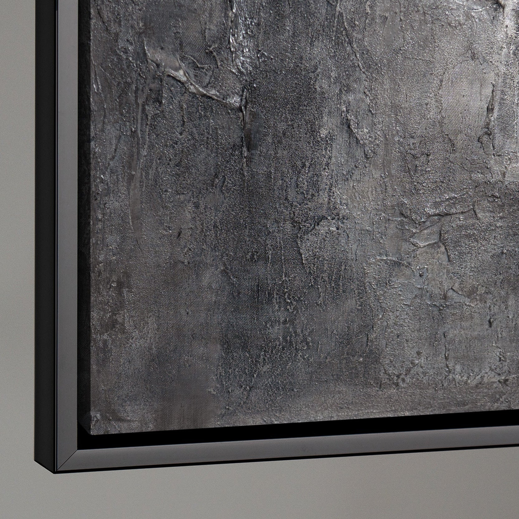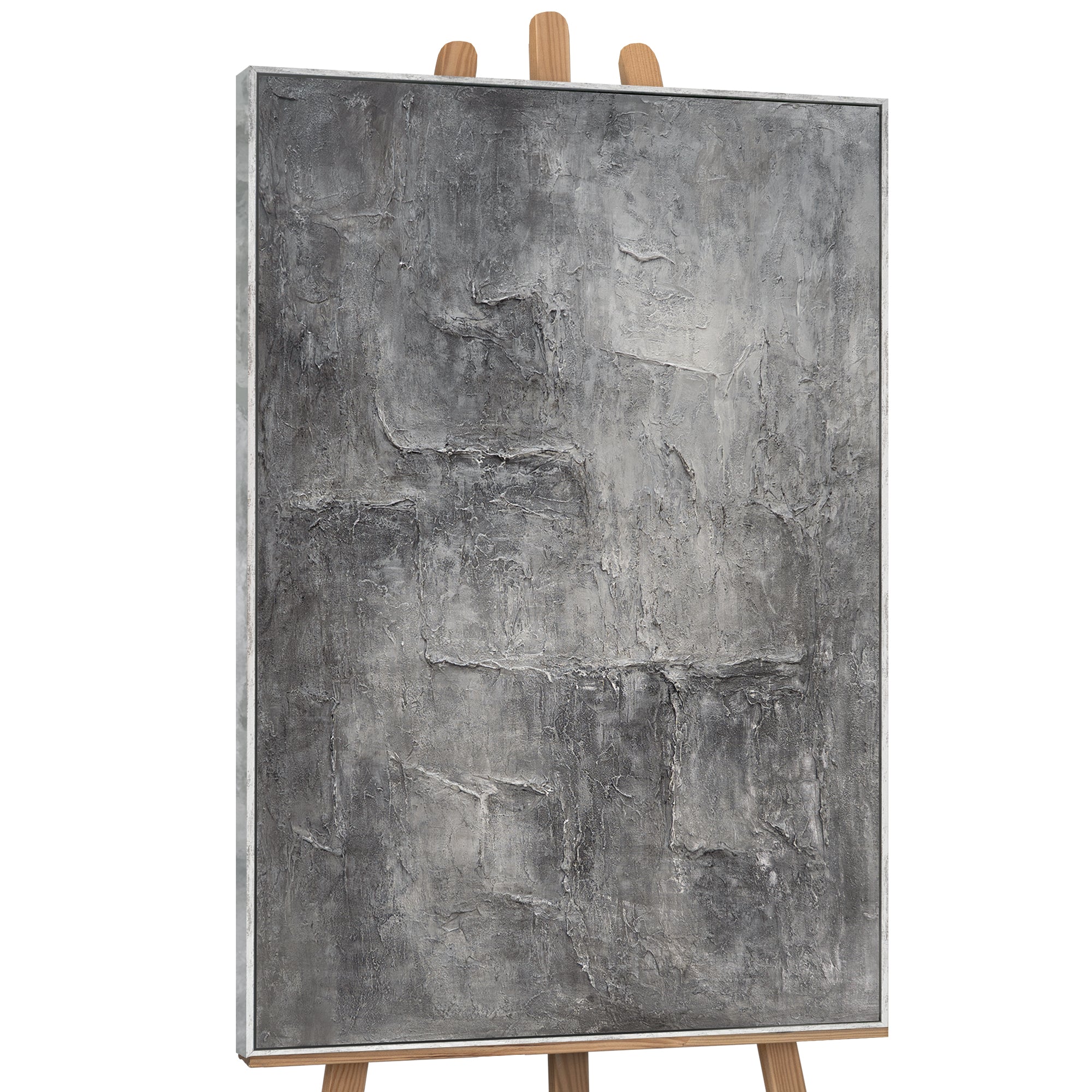"Memory of Stone" embodies the quiet power of time and matter. Rough textures unfold in varying shades of gray, reminiscent of weathered stone and urban surfaces. The three-dimensional depth of the hand-painted relief creates a play of light and shadow that shifts with every perspective.