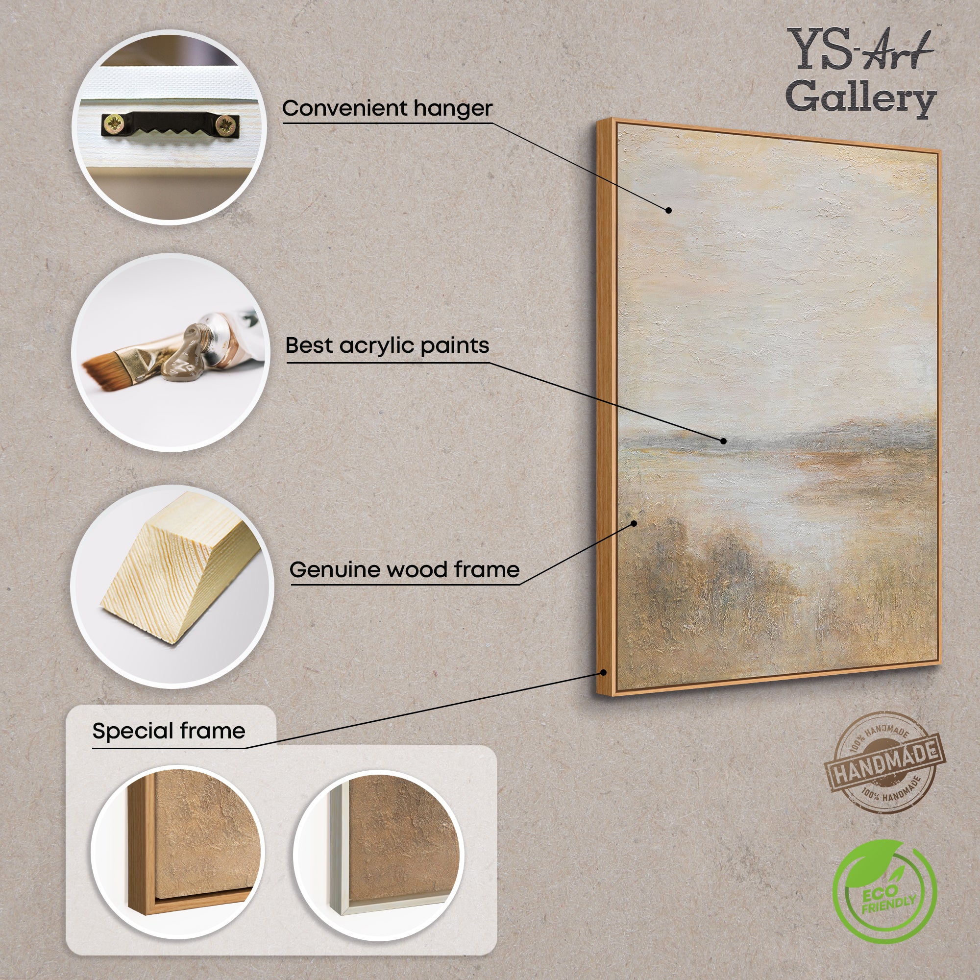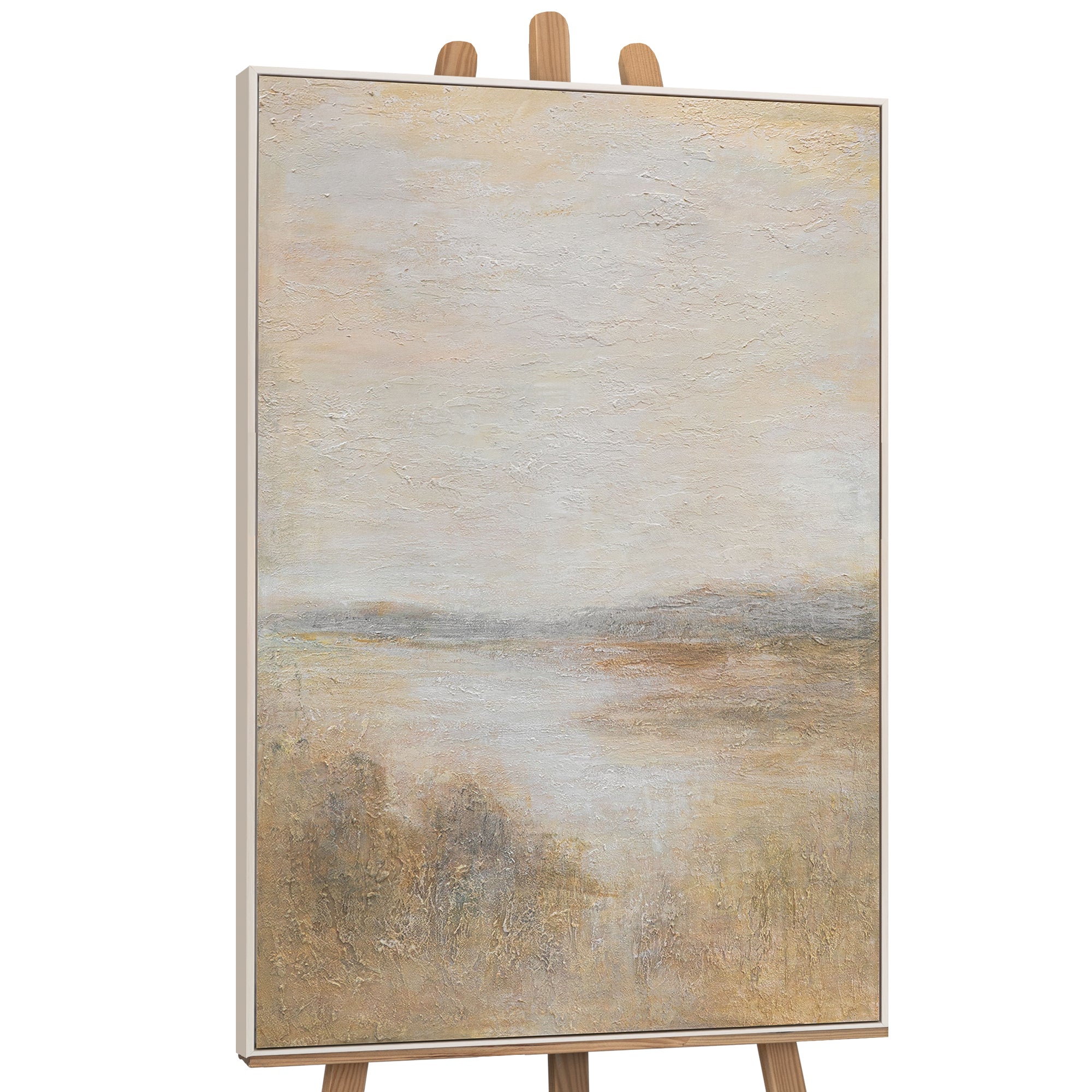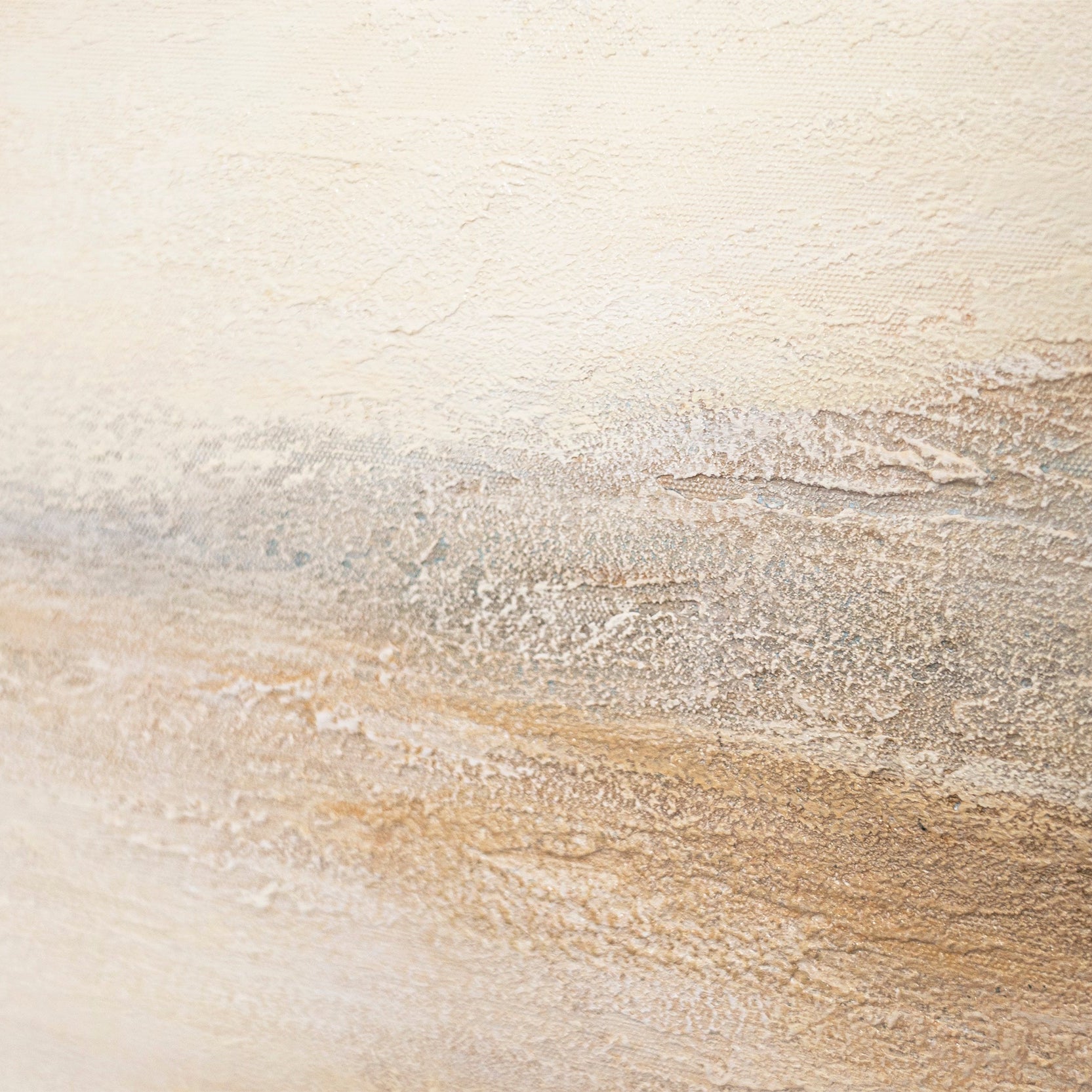 "Misty Morning" captures the quiet poetry of a dawning day. Soft beige tones, subtle shades of gray, and delicate reflections of light create an atmospheric landscape that conveys both tranquility and depth. The textured surface lends the artwork a tangible feel, as if mist were drifting across a vast plain.