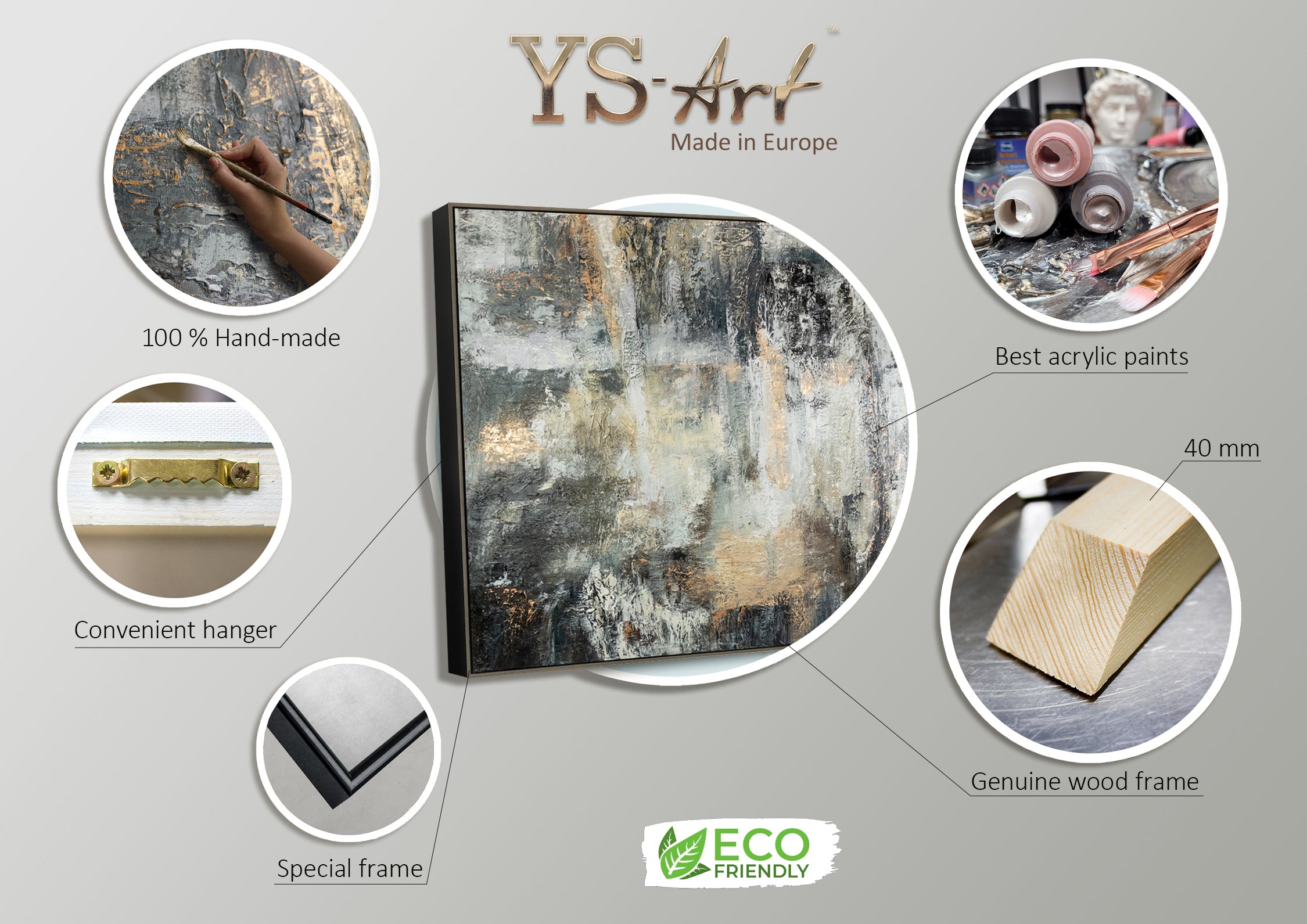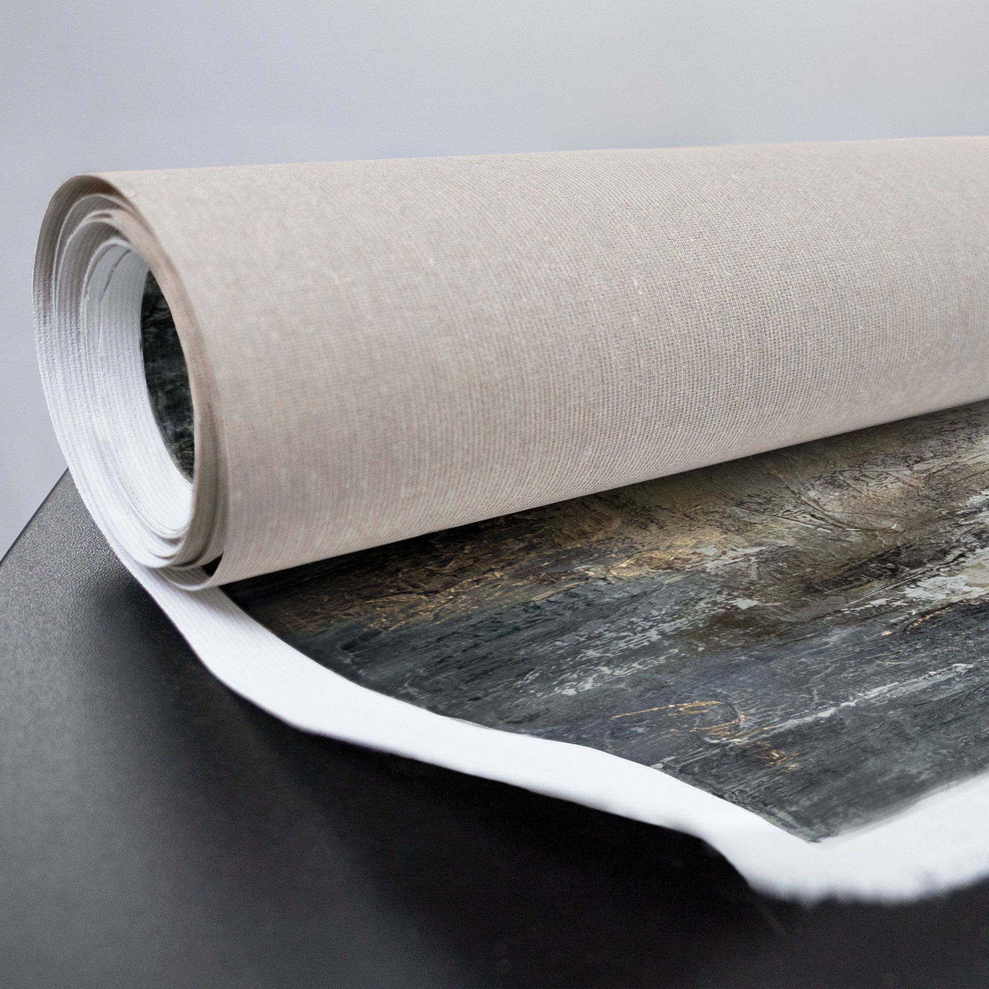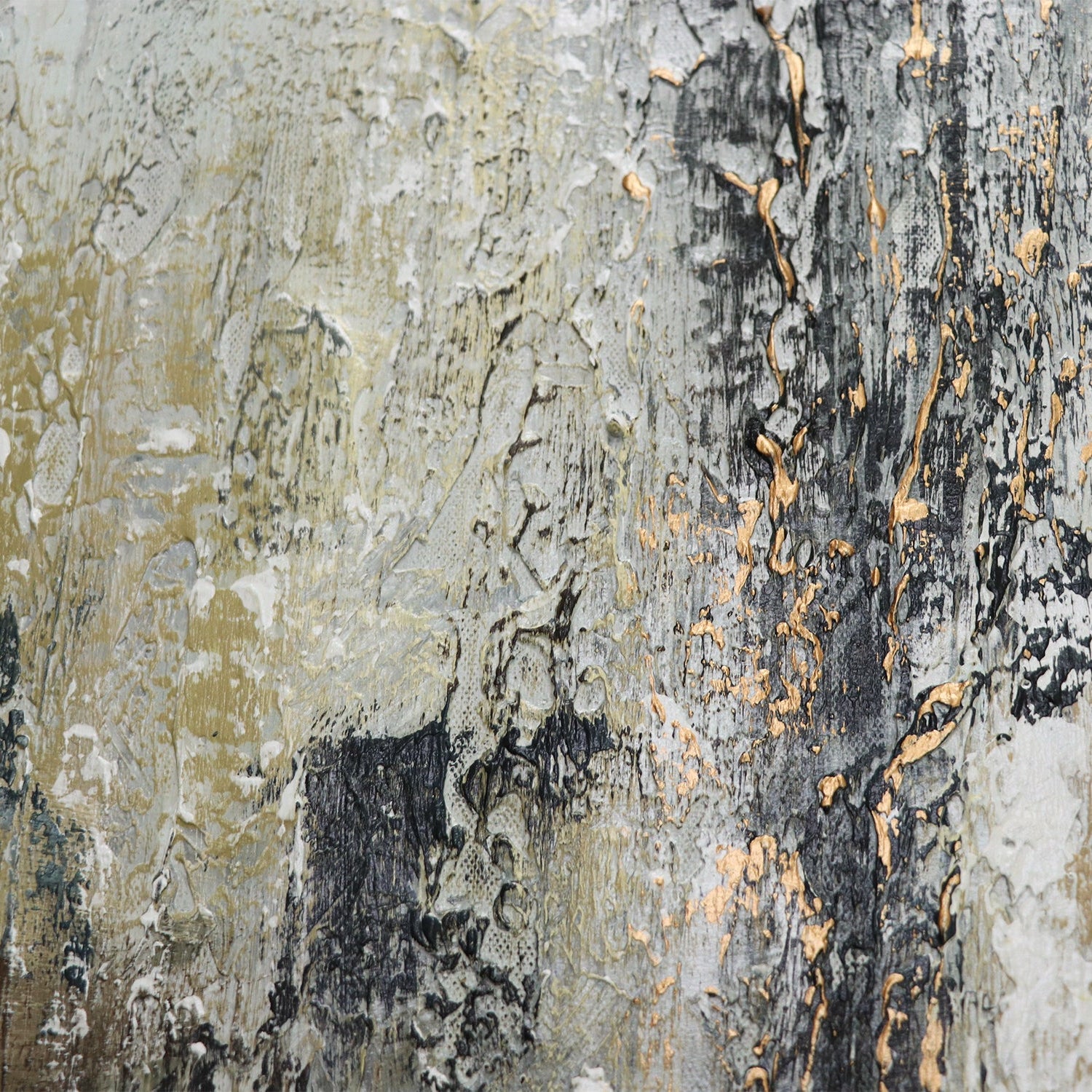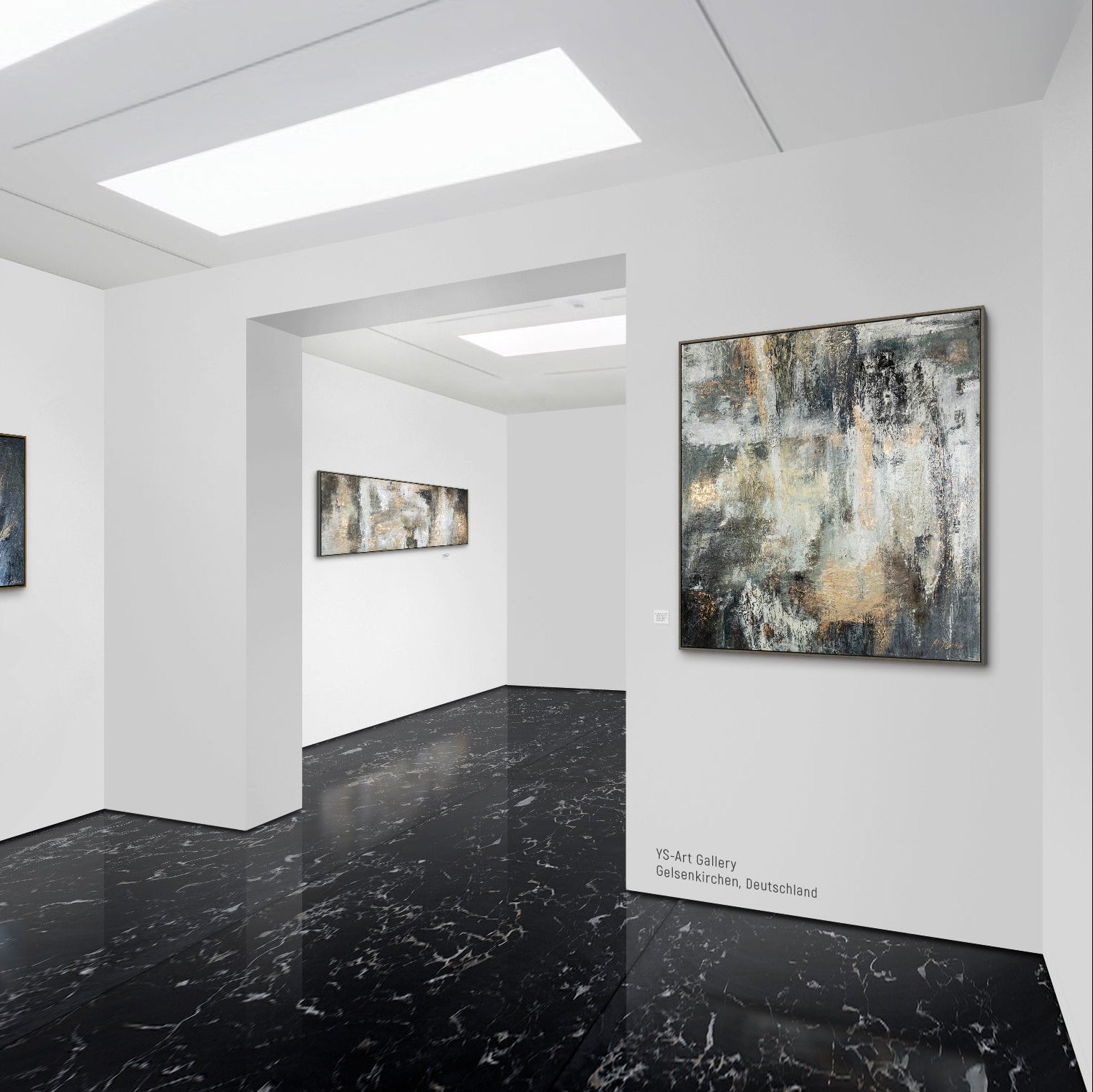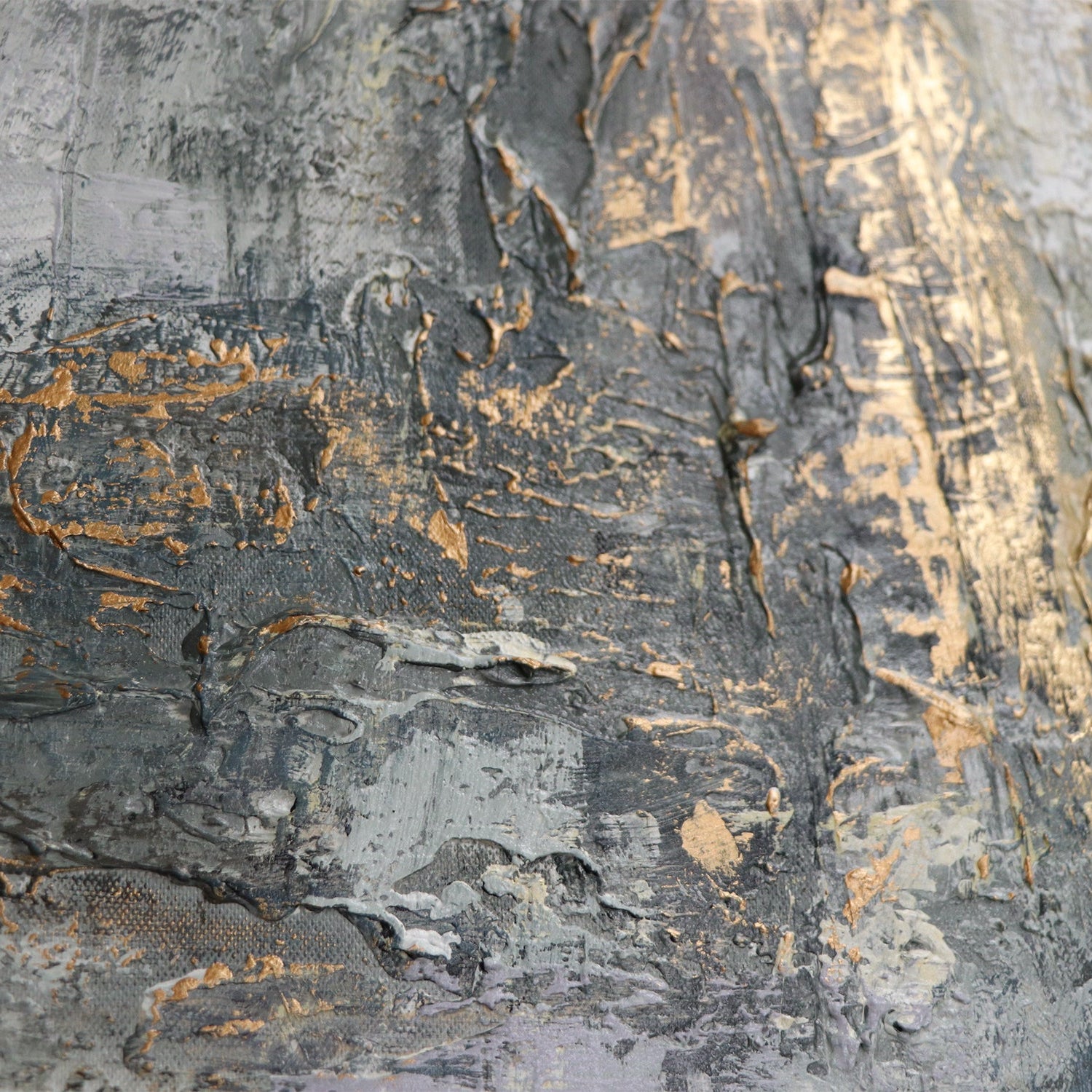 This unique abstract canvas painting embodies modern art at its most fascinating. The harmonious blend of cool gray and blue tones, adorned with golden accents, gives the artwork special depth and a calming aura. Each brushstroke tells its own story, while the intricate texture and soft color gradients make the piece come alive.