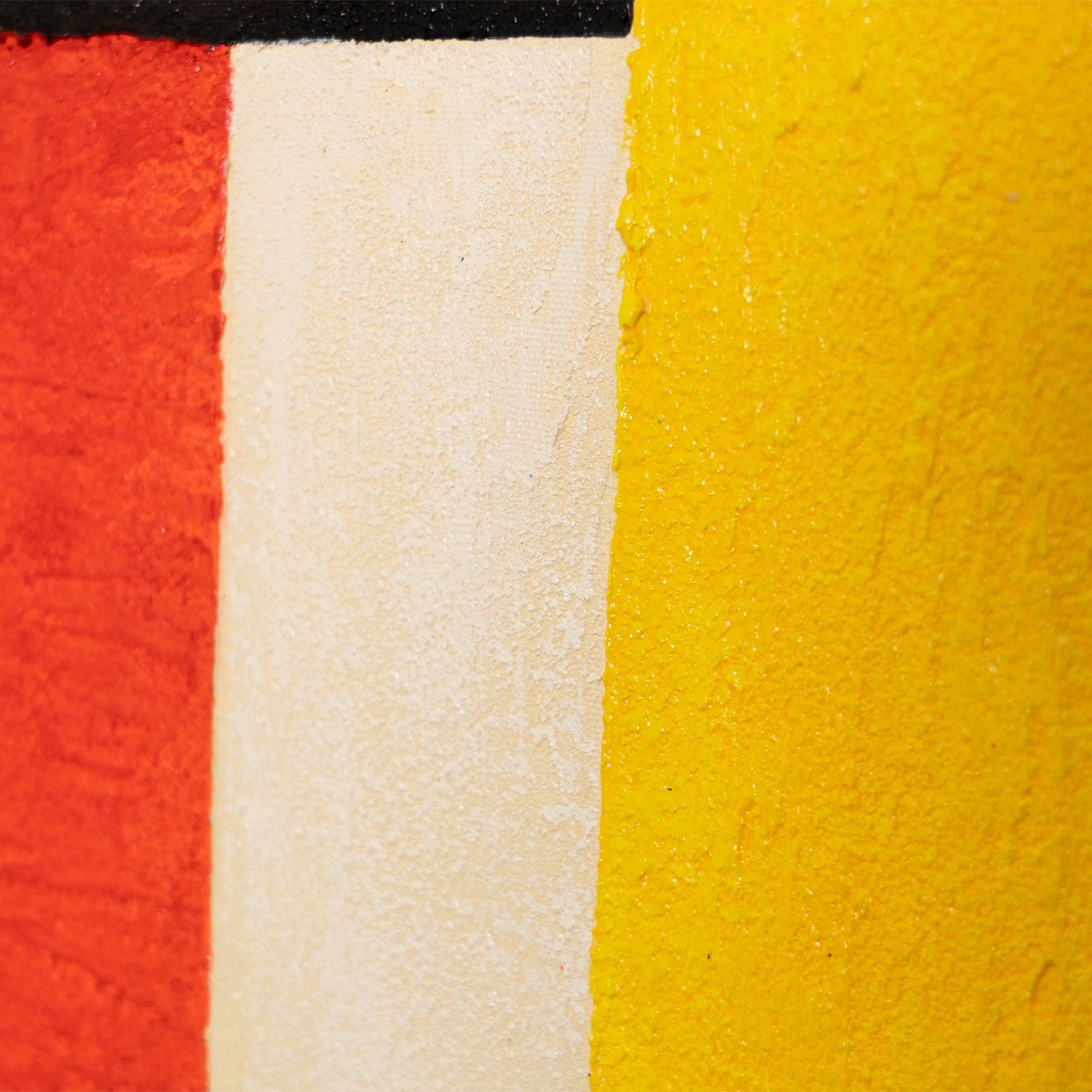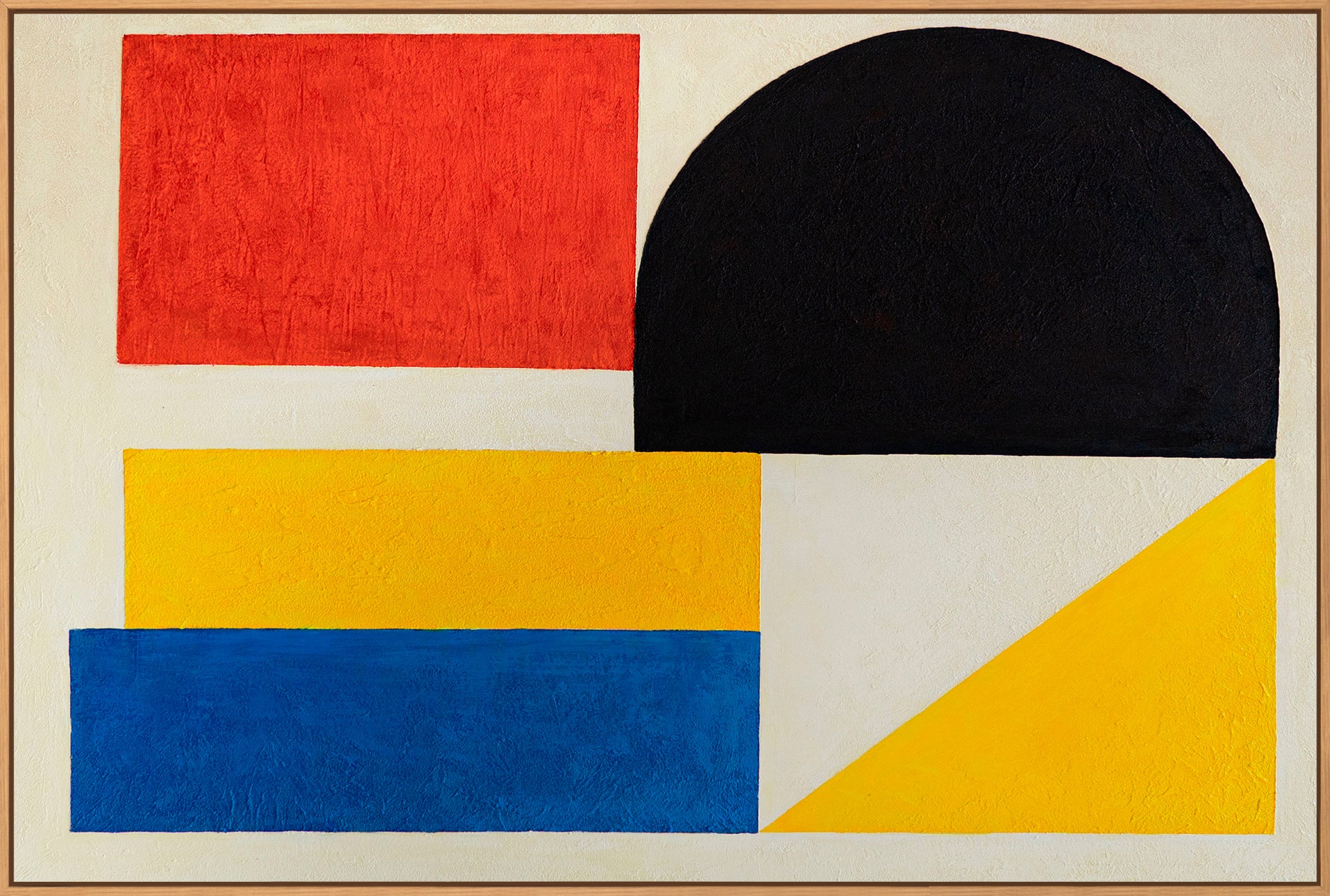 This abstract painting thrives on clear color fields and strong contrasts. Intense reds, yellows, and blues meet deep blacks and serene light areas. The geometric composition appears balanced yet powerful, while the textured acrylic surface clearly emphasizes its hand-painted character.