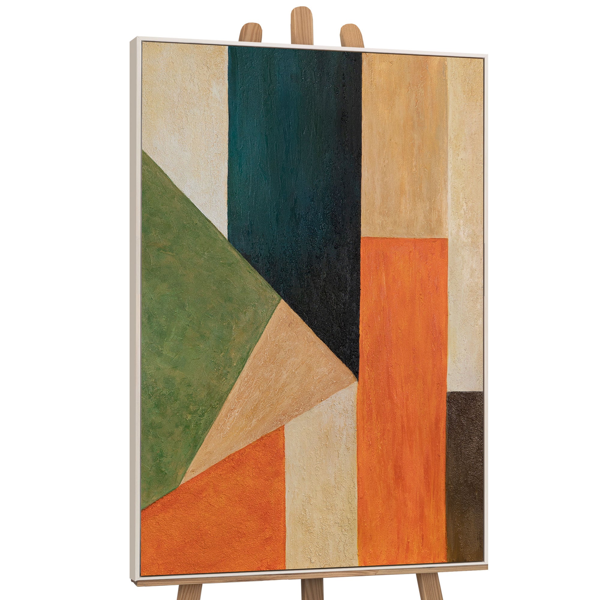„Ordnung und Bewegung“ vereint klare Linien mit lebendigen Farbakzenten. Geometrische Flächen in Orange, Grün, Schwarz und Beige bilden ein spannungsreiches Zusammenspiel aus Stabilität und Dynamik. Die Struktur des Acryls verleiht der Komposition Tiefe und taktile Ausdruckskraft.