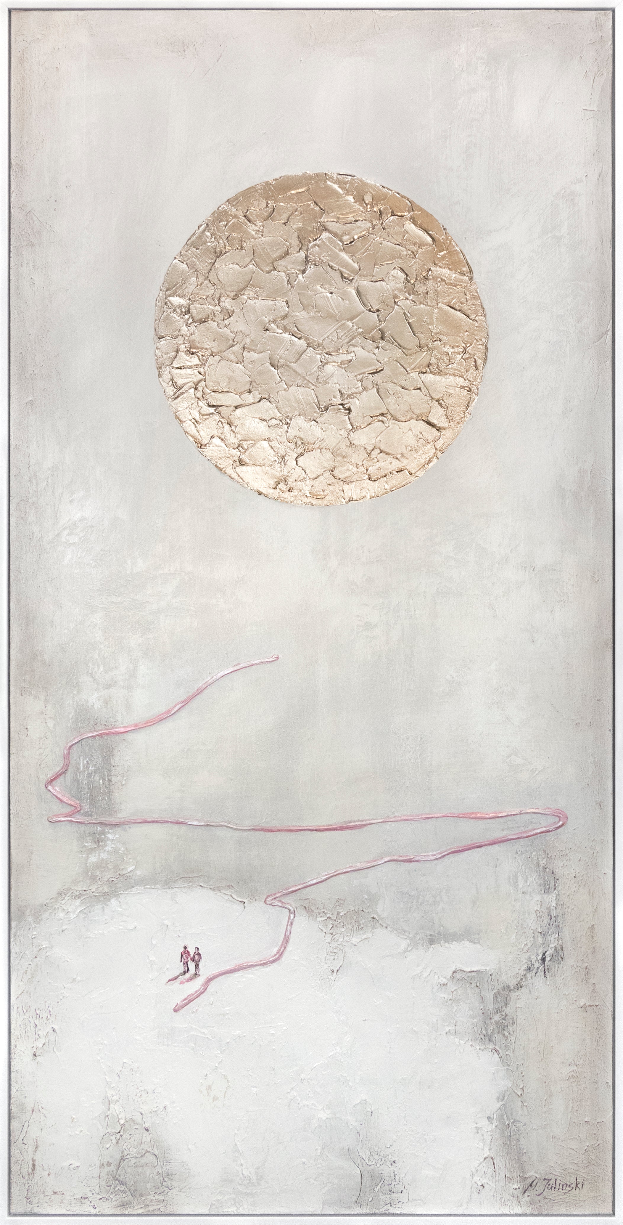 “Path to the Sun” is an elegant abstract acrylic painting with golden accents on a white and grey textured surface. The suggested mountain formations add depth and symbolize the journey toward enlightenment and harmony. Golden highlights on the matte finish create a refined contrast and radiate calmness.