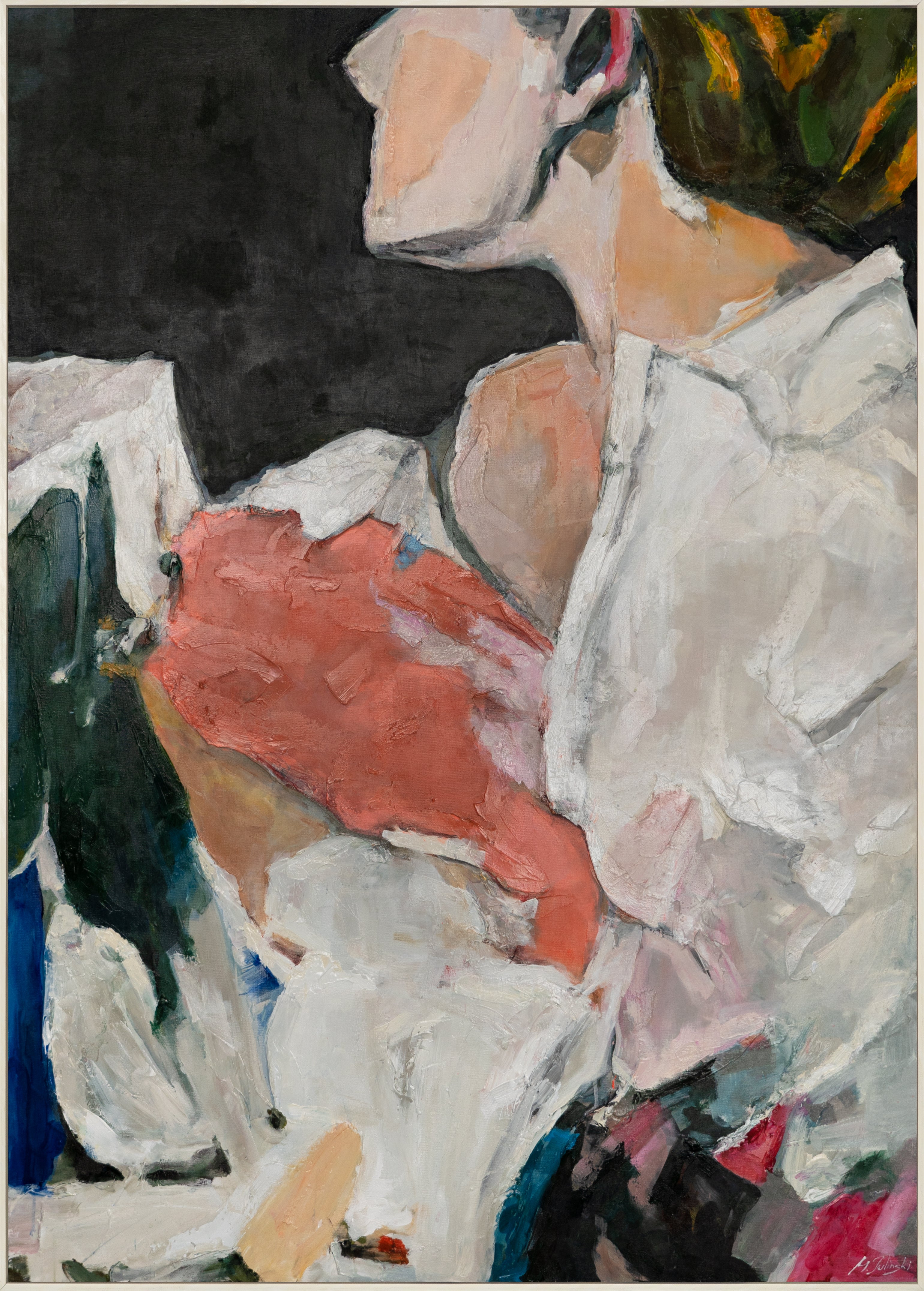 This hand-painted composition features a minimal yet expressive female silhouette, set against a harmonious blend of muted pinks, creams, grays, with subtle accents of green and black. The abstract facial form adds a mysterious aura, while bold brushstrokes and thick layers of paint create rich texture and depth. The interplay of shapes and surfaces brings a modern yet sensitive artistic touch to any space.