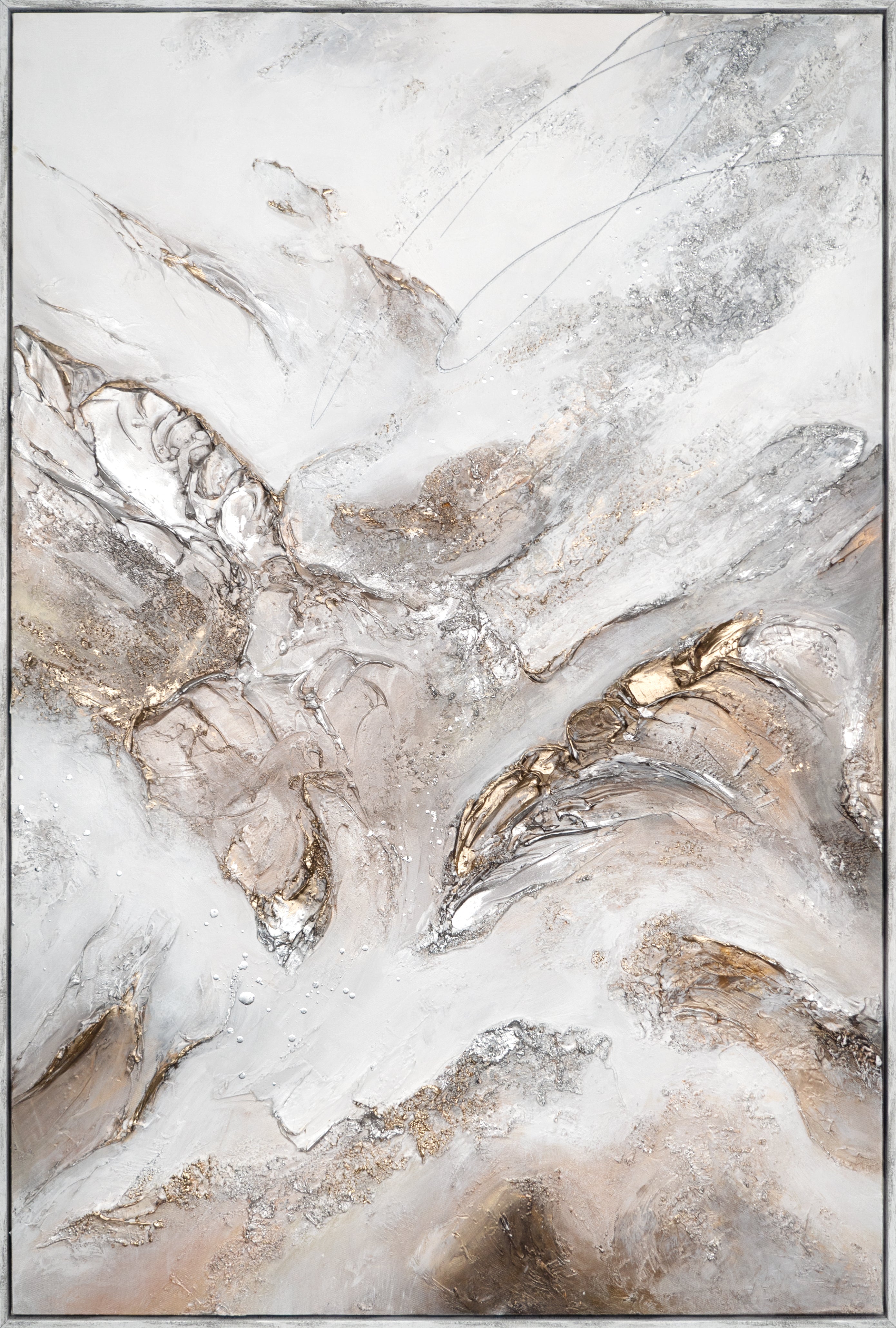 A fascinating interplay of movement, structure, and color nuances unfolds in the painting "Ascension." With flowing lines and shades of Beige, White, and Gold, the painting creates a powerful dynamism – almost like a landscape in transformation. The relief-like surface gives the artwork additional depth, anchoring the abstract composition in three-dimensionality.