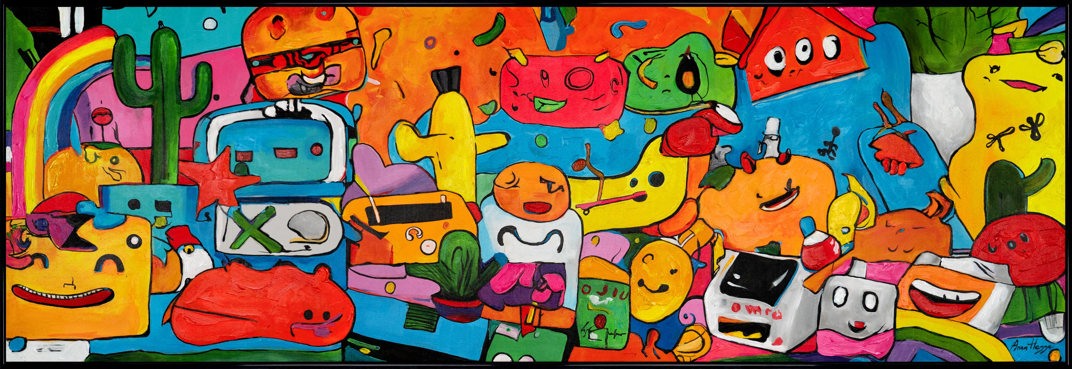 A unique artwork full of joy: "Colorful World" features a playful scene with colorful, cartoon-like figures on a deep black background. The bold colors – Yellow, Orange, Pink, Blue, and Green – along with the textured surface, create an intense visual dynamism that immediately catches the eye. Each figure seems to tell its own story, making the painting an exciting experience.