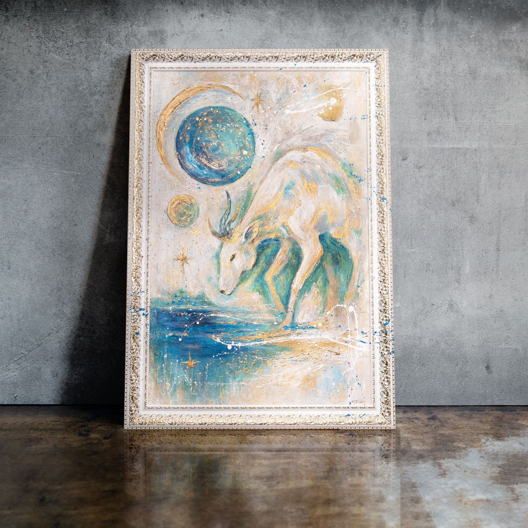 „Moon Guardian“ is a mystical fantasy painting that unites the power of nature with the magic of the universe. A white deer steps into a surreal scene of moons, stars, and cosmic light. Golden and turquoise accents give the artwork depth and a spiritual glow.