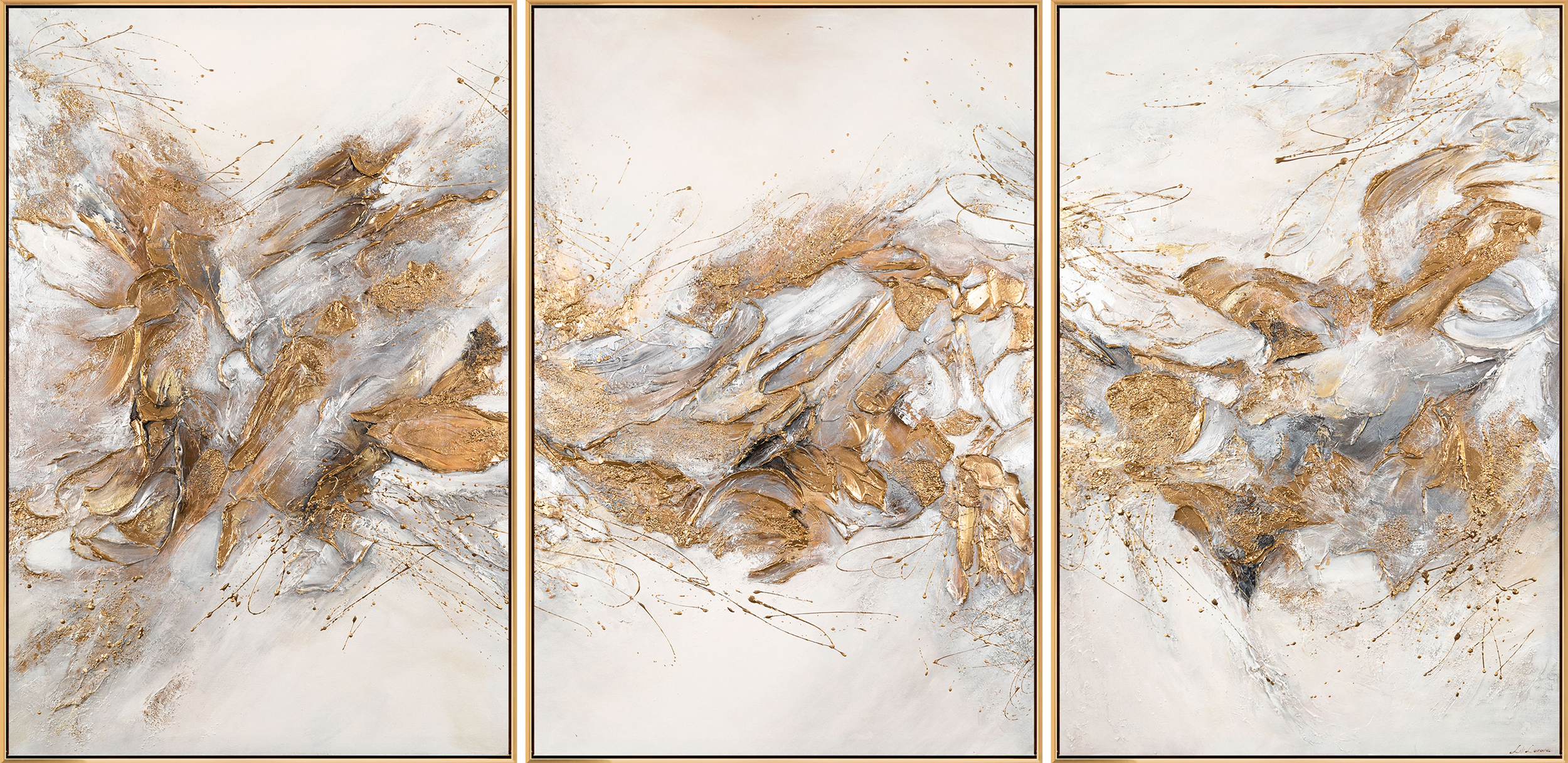 Enrich your home or office with this elegant abstract triptych, which creates a harmonious composition through its golden and white tones. The painting impresses with its bold colors and expressive brushstrokes. It is 100% hand-painted and is highlighted by elegant frames.