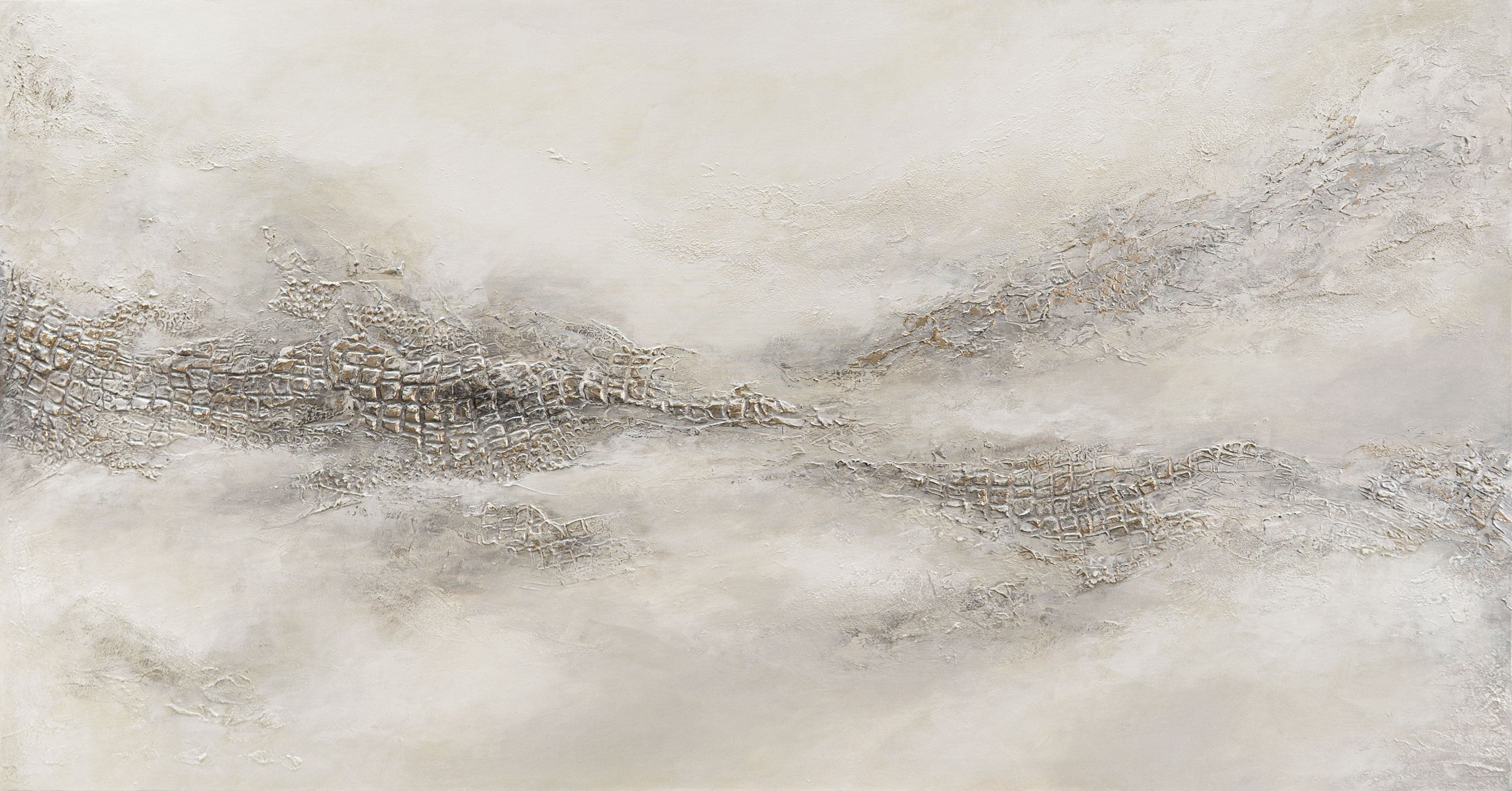 „Nebulöse Ferne“ entfaltet die stille Schönheit des Ungewissen. In sanften Grautönen und zartem Beige verschmelzen Texturen zu einer nebligen Weite, die zwischen Traum und Erinnerung schwebt. Die erhabene Struktur verleiht der Oberfläche Tiefe, während das Licht über die reliefartigen Flächen gleitet – wie ein ferner Horizont, der sich im Dunst verliert.