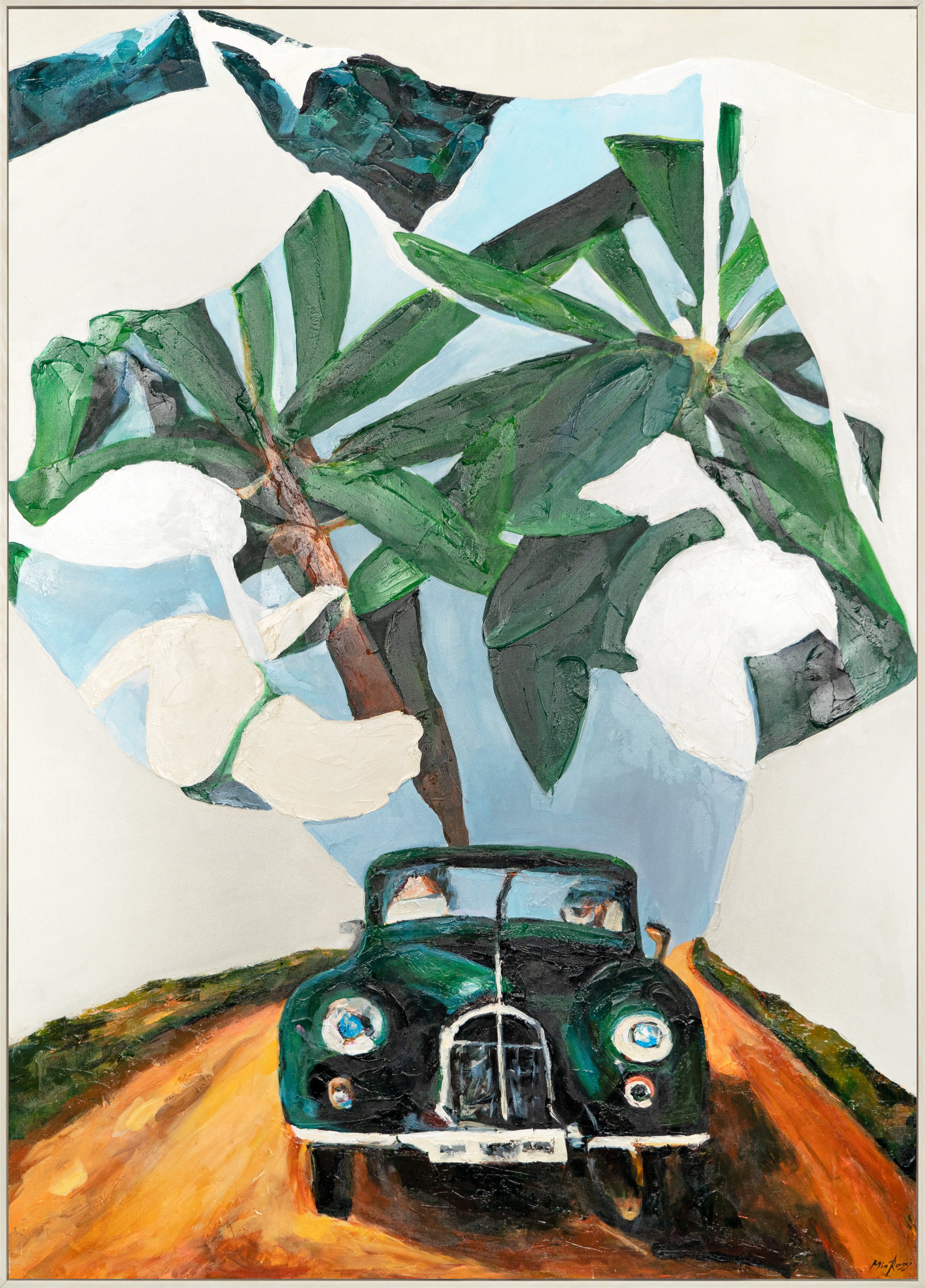 "Auto & Nature" is a hand-painted acrylic canvas that explores the interplay between nature and machine. Vibrant green foliage surrounds a vintage car, creating a colorful abstract composition that is both nostalgic and modern. This original artwork is perfect for bold interiors that embrace contrast and character.