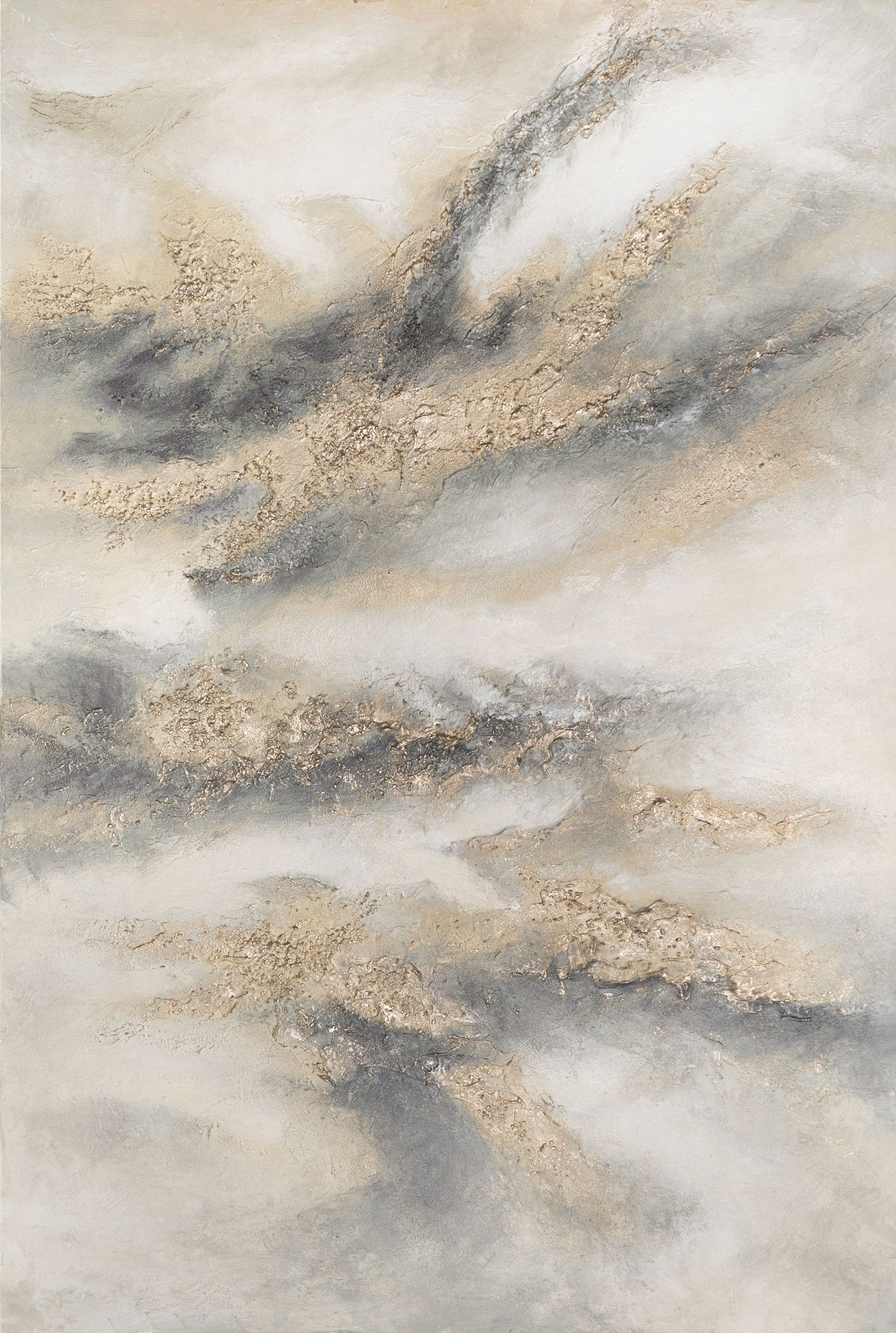 Bring tranquility and elegance into your home with this hand-painted textured painting. Soft cloud shapes in Gray, Beige, and White merge harmoniously with golden accents, giving the painting a noble, almost floating lightness. Every brushstroke and relief texture makes this piece a unique art object.