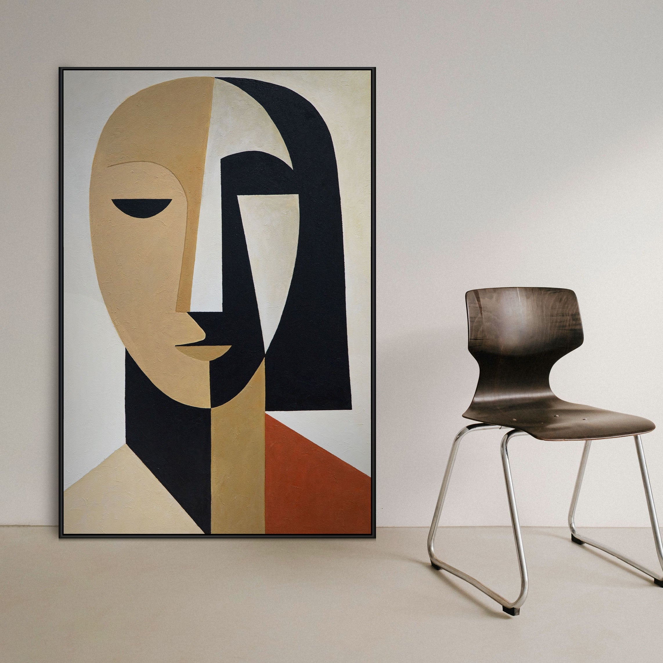 "Geometry of the Face" is an homage to the clarity of form and the expressiveness of Cubism. The minimalist facial motif unites geometric elements in beige, black, and warm terracotta. Each facet speaks of balance and emotion, of the quiet harmony between abstraction and humanity.