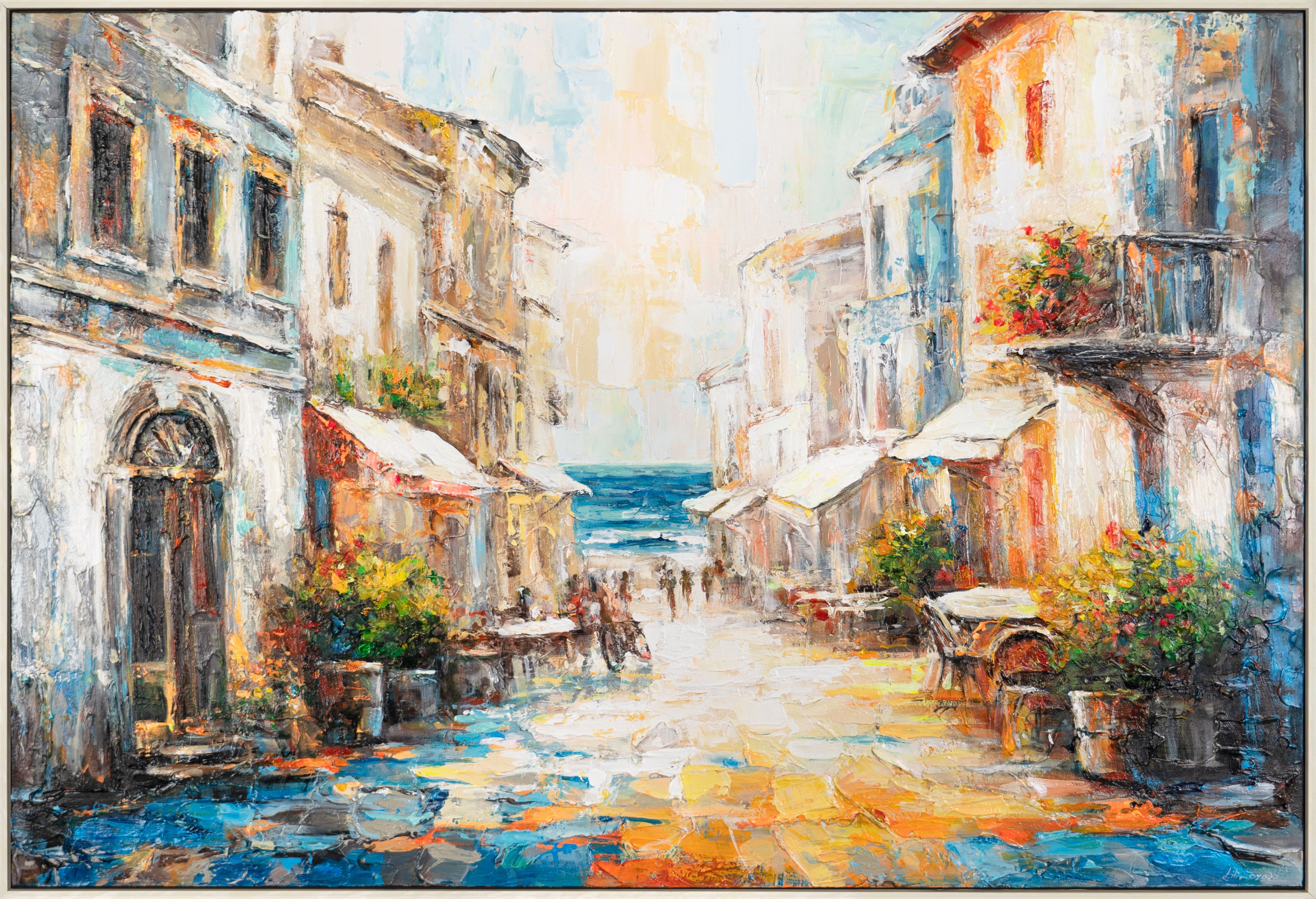 "Warm Breeze" is a hand-painted acrylic artwork that captures the serene charm of a Mediterranean village. The piece showcases a charming street that opens up to the sea, filled with lively colors and textured brushstrokes. The balance of light, architecture, and nature creates a calming and joyful atmosphere.