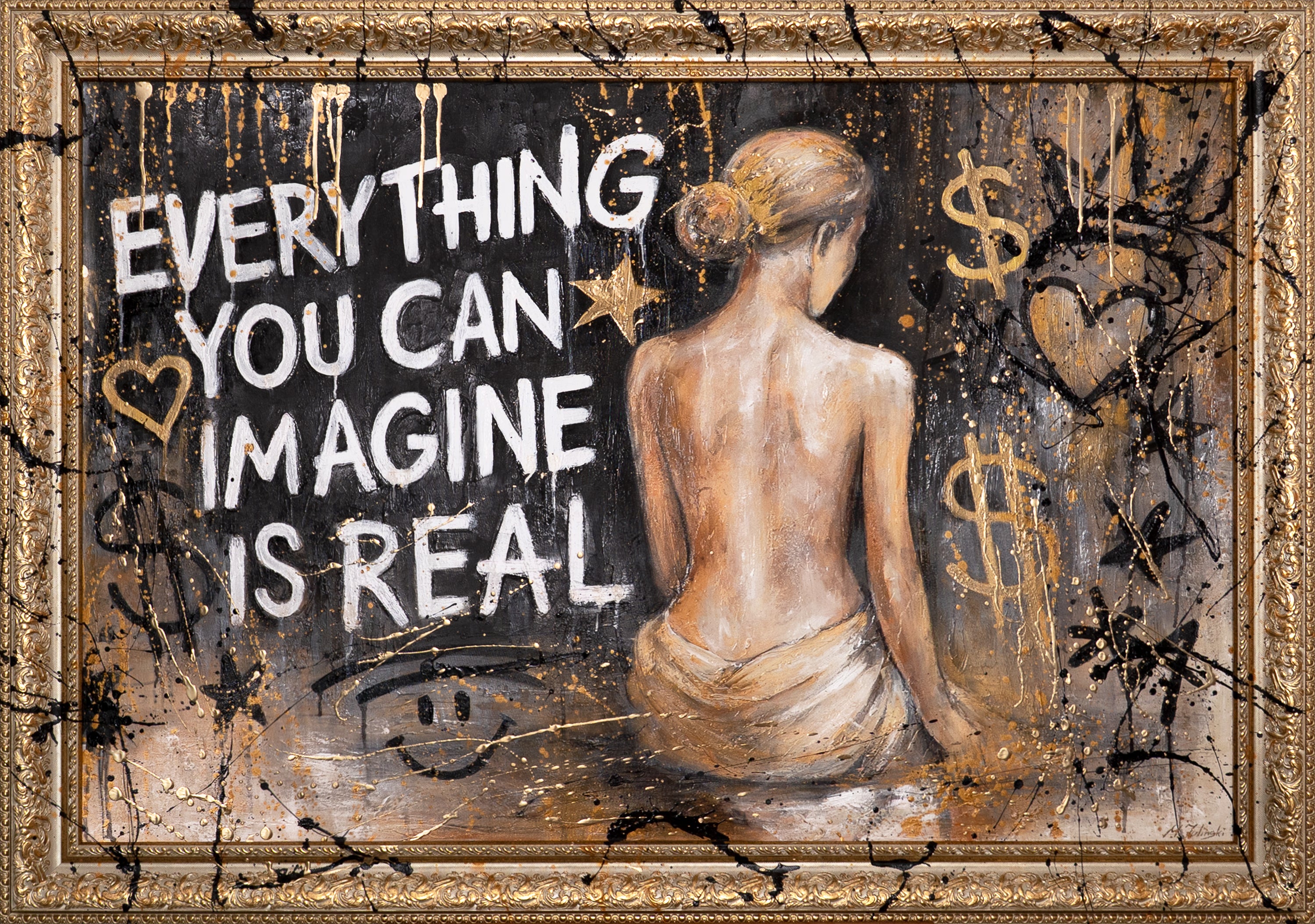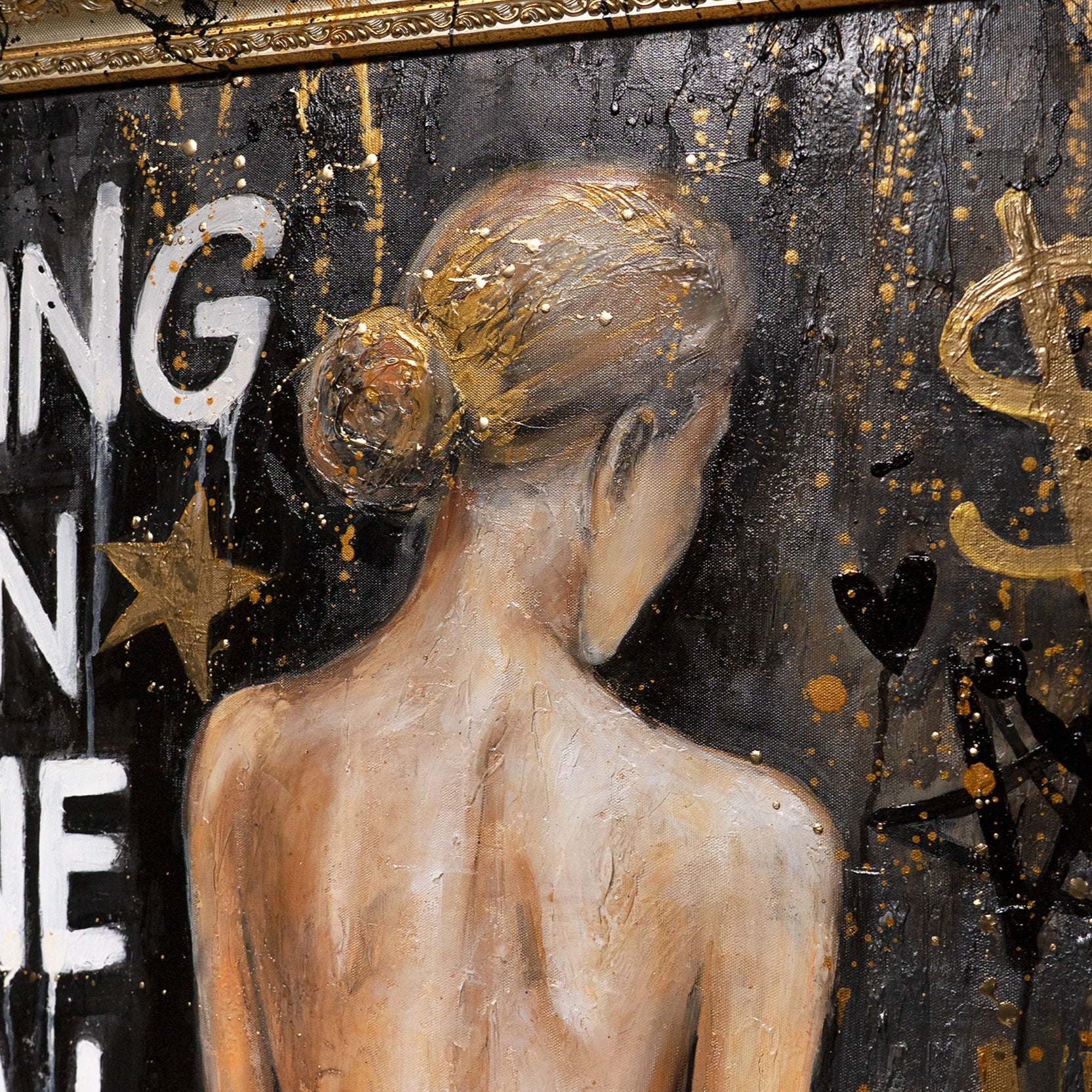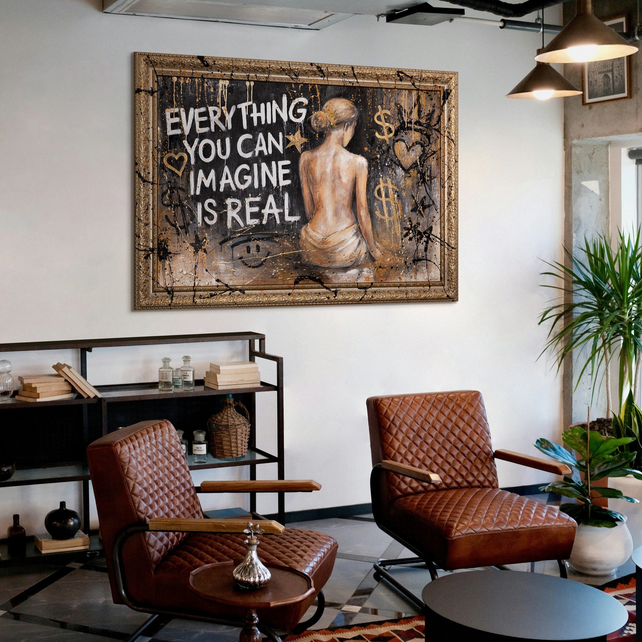 The hand-painted canvas „Everything is Possible“ is more than decoration – it’s a statement. Inspired by modern street art and classical painting, it combines lettering with figurative elements. Warm gold tones and contrasting black-and-white accents make it a true highlight for any home.