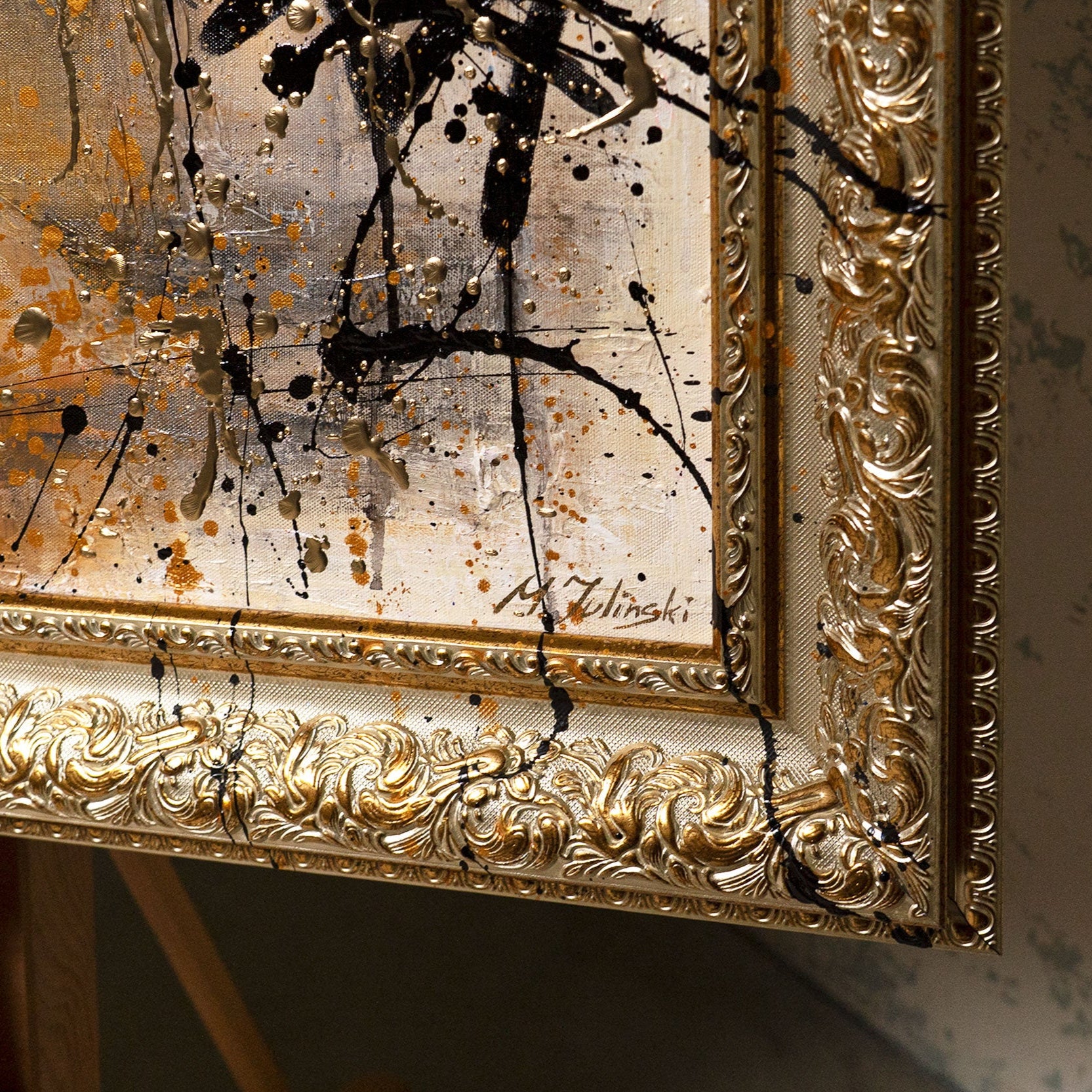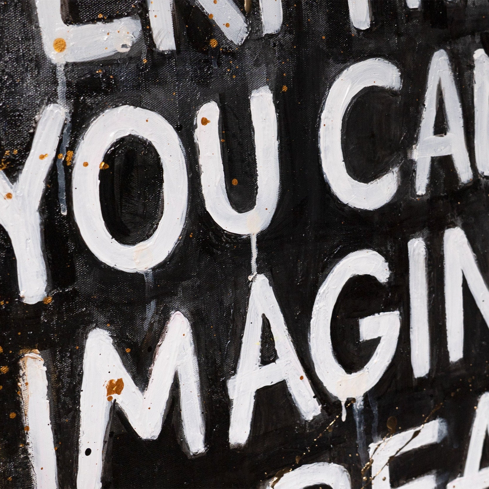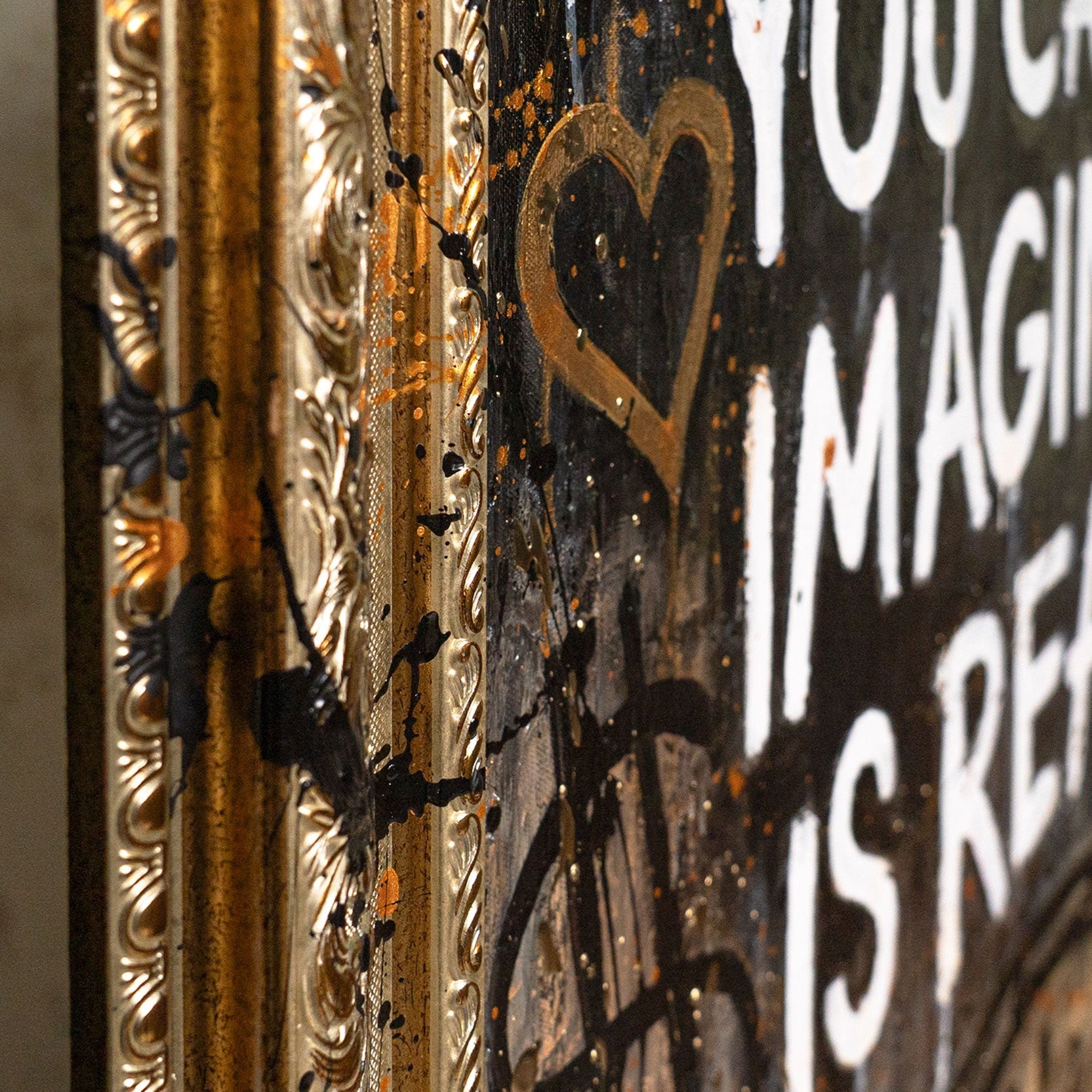 The hand-painted canvas „Everything is Possible“ is more than decoration – it’s a statement. Inspired by modern street art and classical painting, it combines lettering with figurative elements. Warm gold tones and contrasting black-and-white accents make it a true highlight for any home.